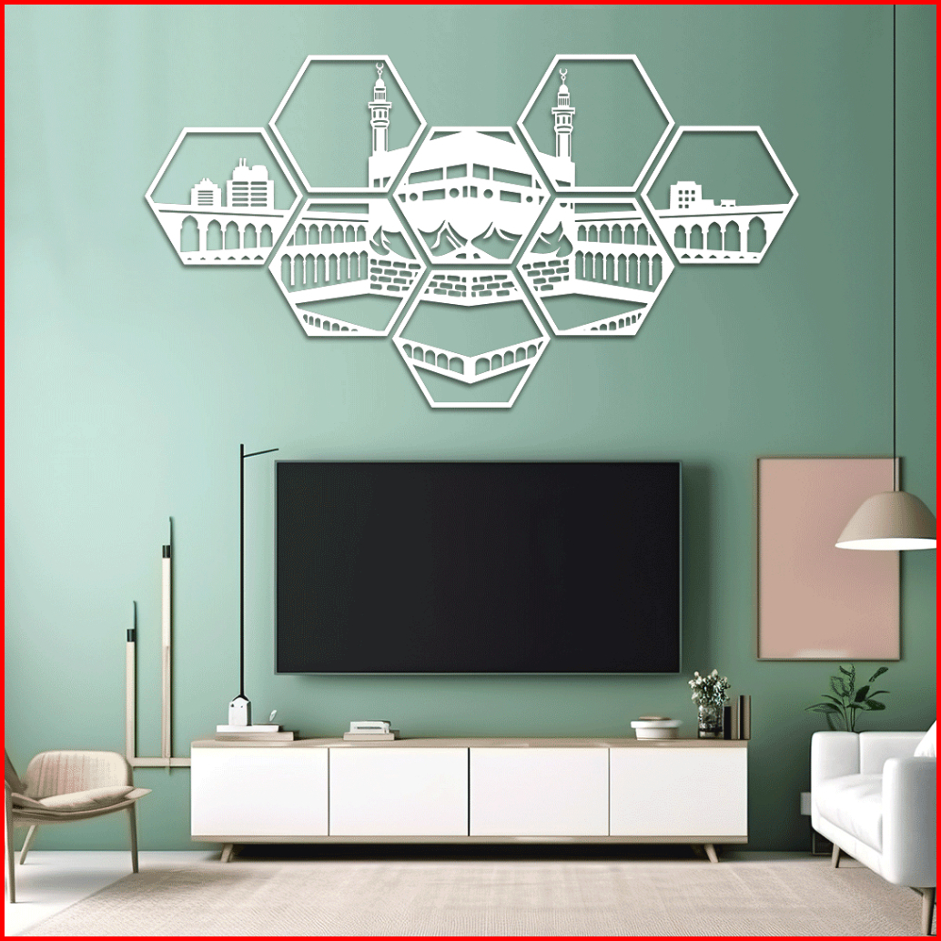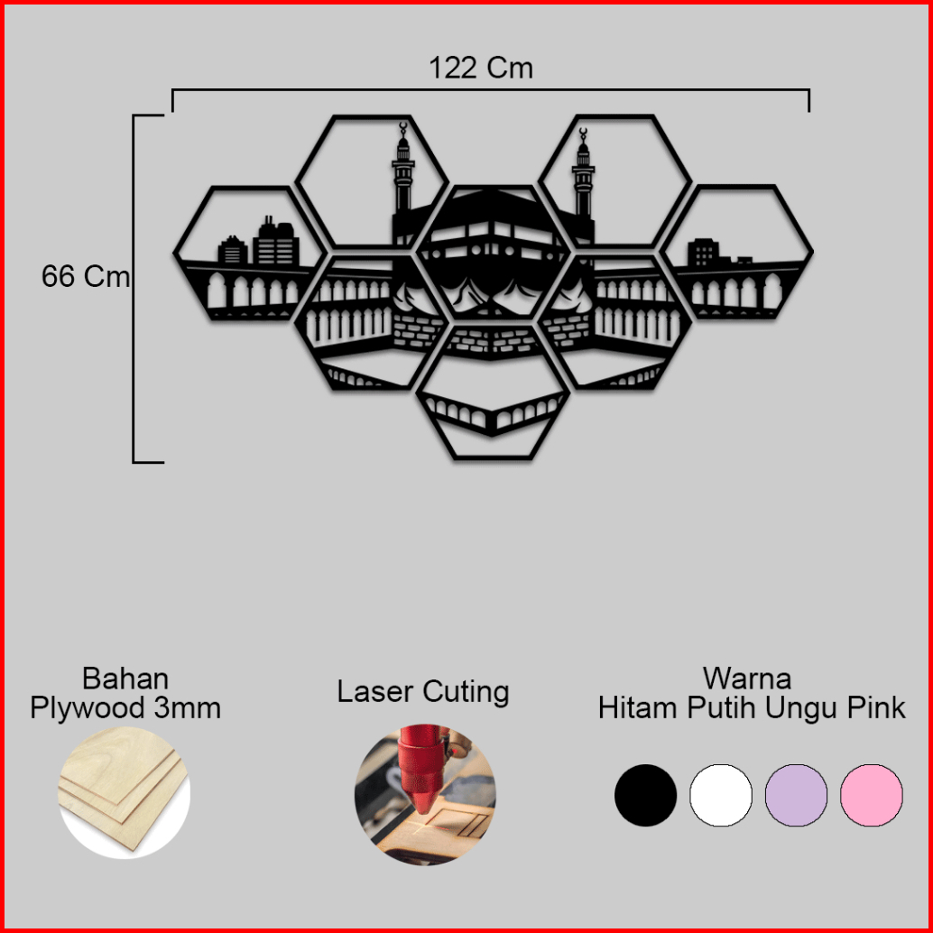Pajangan Dinding Kayu Dekorasi Ruangan Minimalis Motif Ka Bah Kaligrafi Islami Hiasan Rumah Aesthetic Hexagon 1set Isi 8