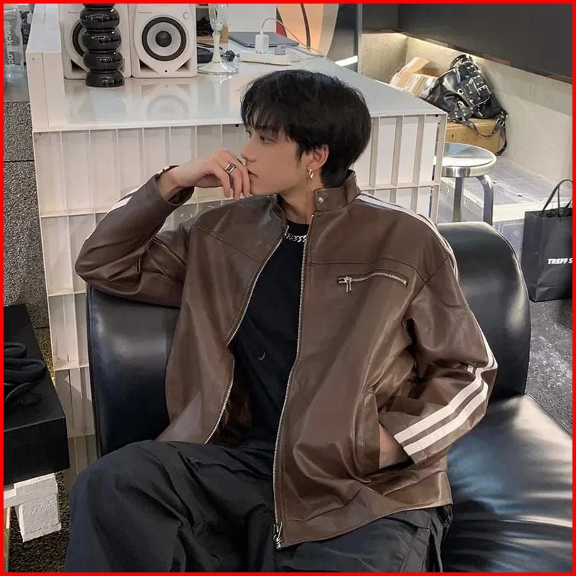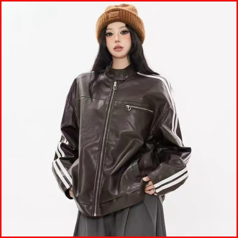 Leather Jaket Motorcycle Jaket Kulit Pria Dan Wanita Strip Oversize