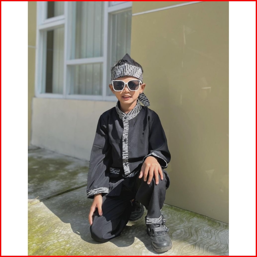 Baju Setelan Pangsi Anak Gratis Iket Kepala Motif Lereng Putih