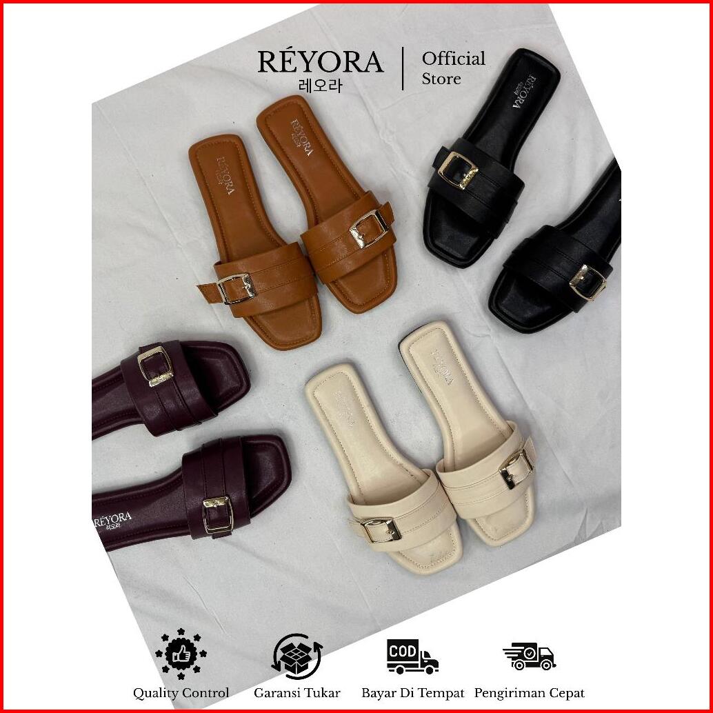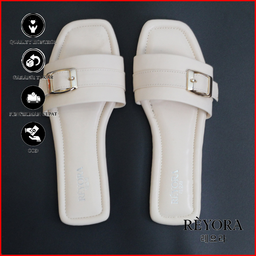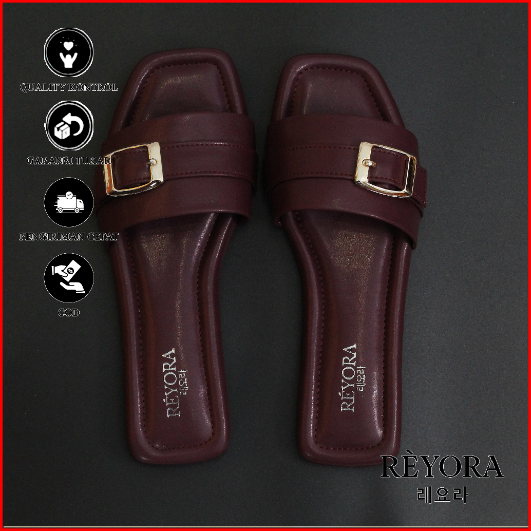 Reyora Sandal Teplek Flat Wanita Kulit Sintetis Korea