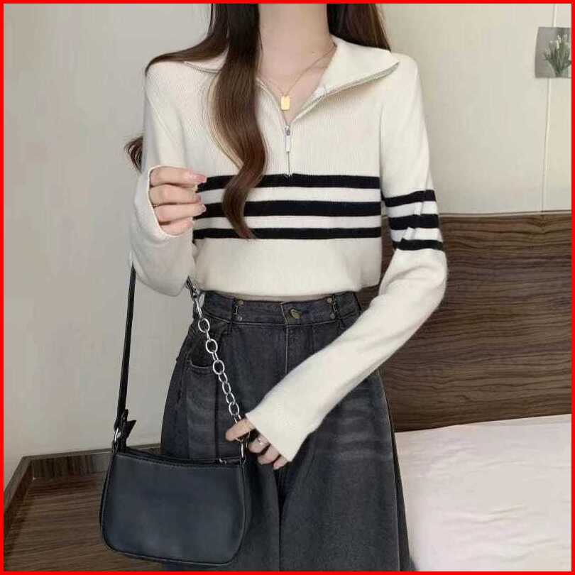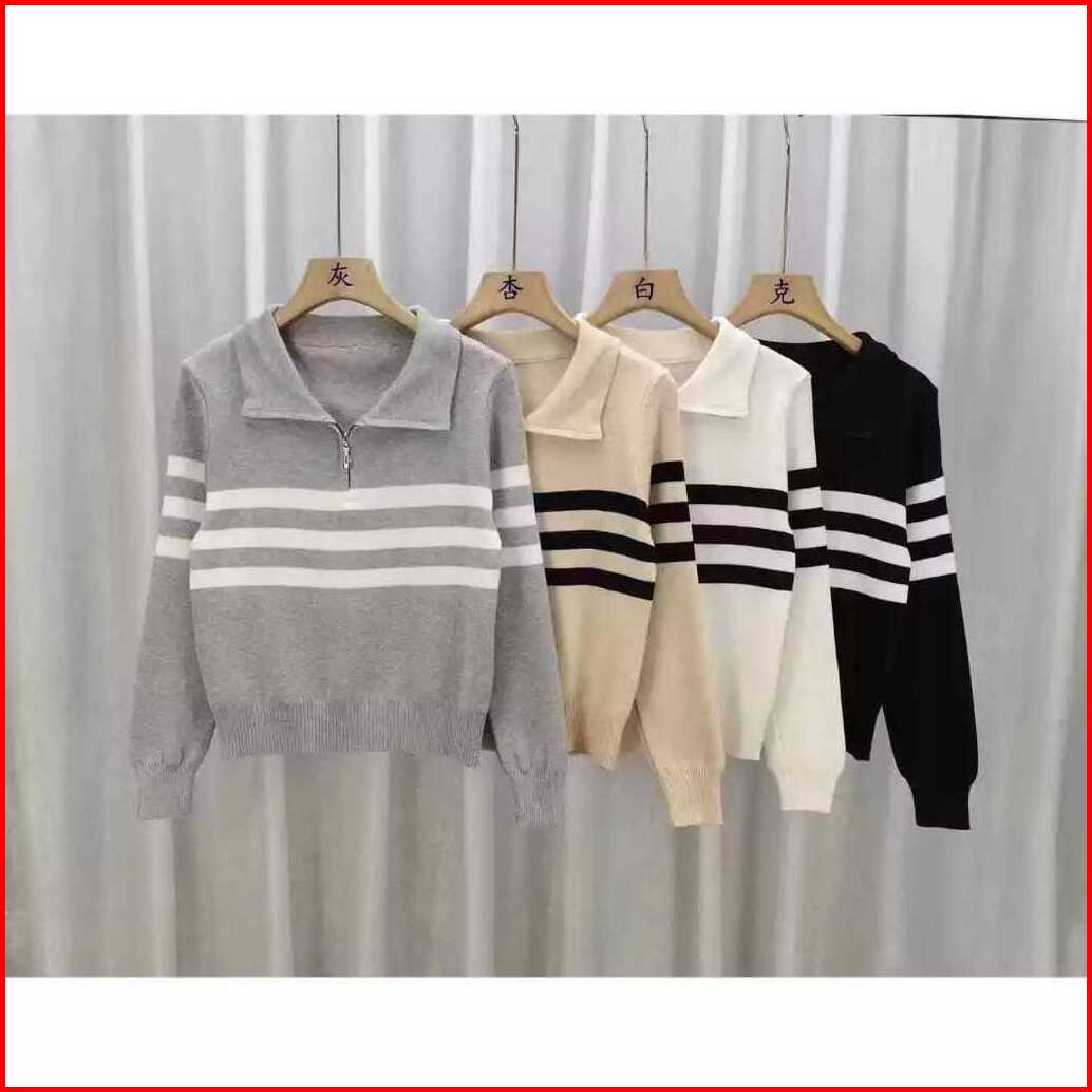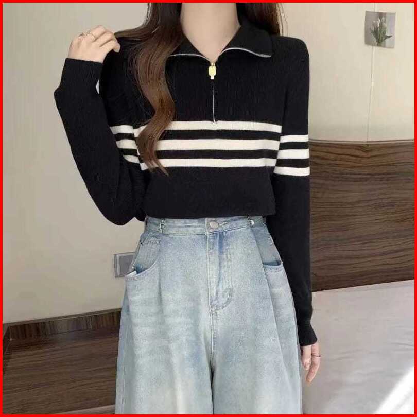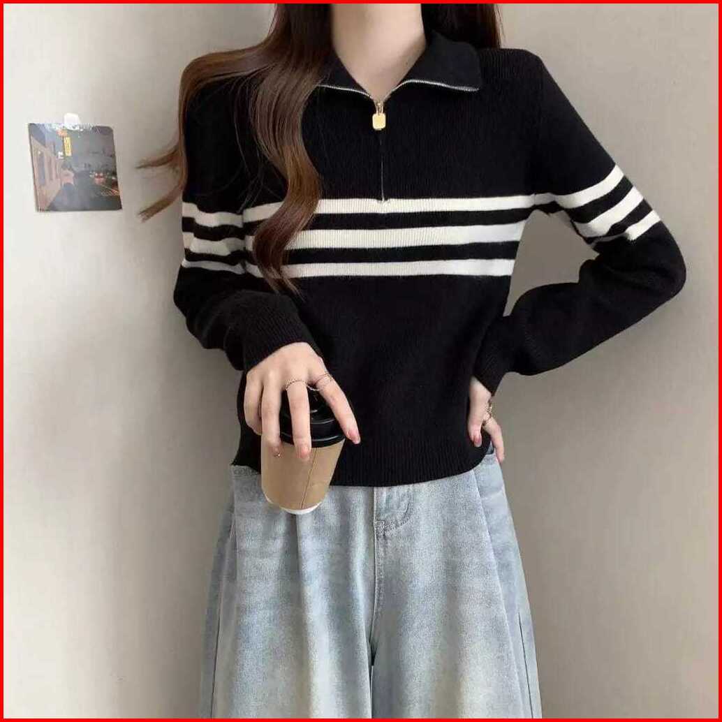 Anailla Atasan Rajut Wanita Swater Zipper Stripe
