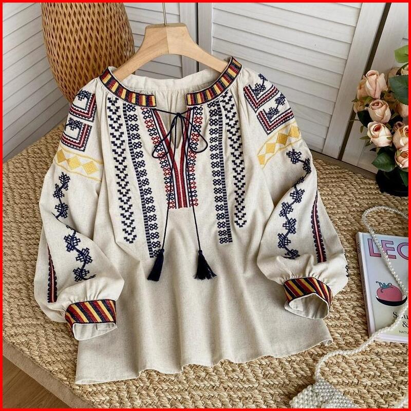 Mdlv M25d77 Bohemian Embroidery Tie Neck Blouse