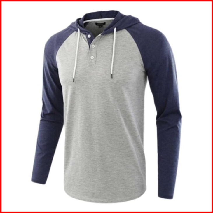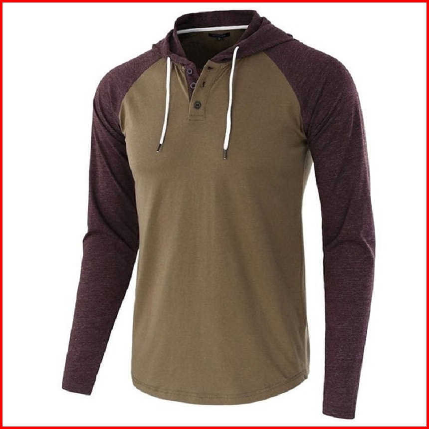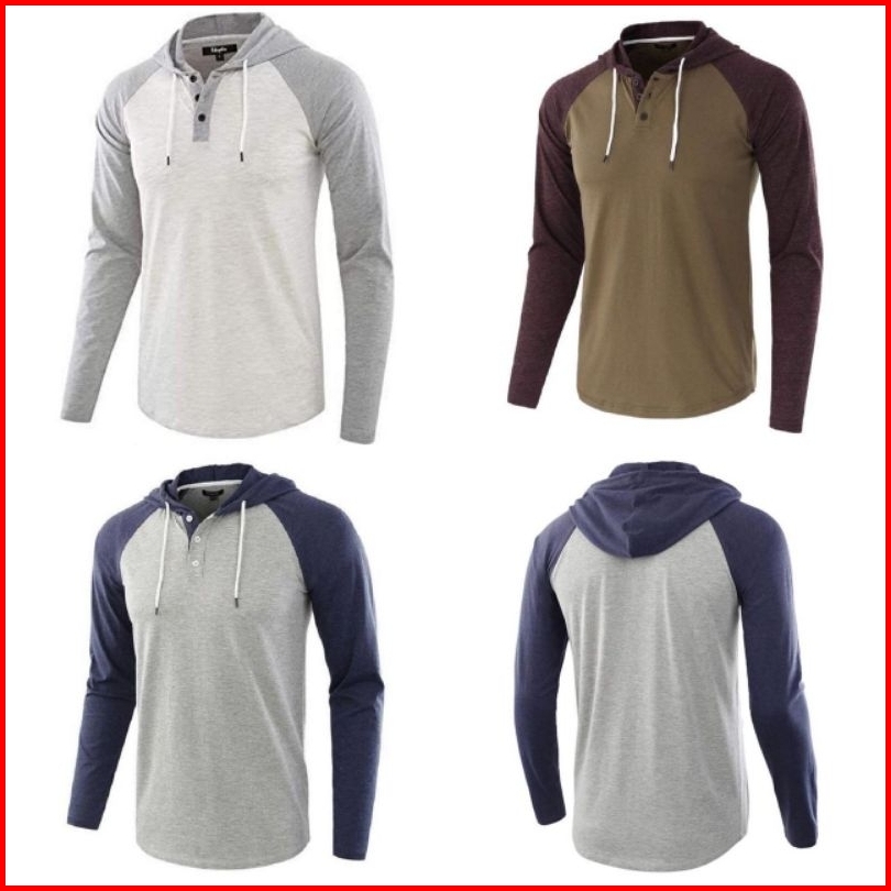 Baju Kaos Pria Lengan Panjang Bertopi Dan Memiliki Tiga Kancing Di Depan Model Hoodie Kupluk Henley Bisa Untuk Atasan Ke