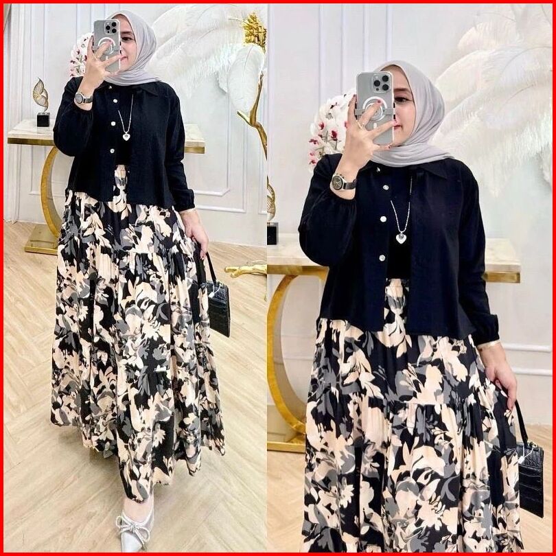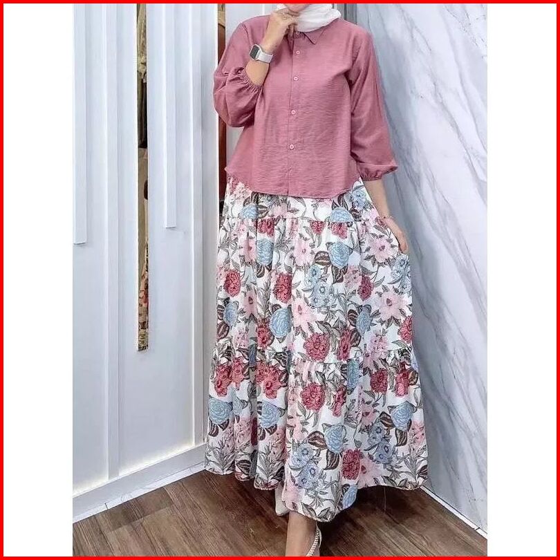 Rose Bunga Set Rayon Rok Kombinasi Crinkle Setelan Rok Motif One Set Rok Wanita Terbaru Ootd