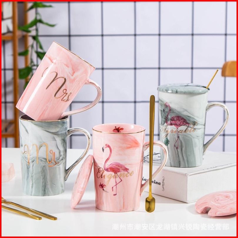 Set Gelas Ceramic Marble Couple Mr Mrs Sepasang Sendok Tutup Box Premium Gift Wedding