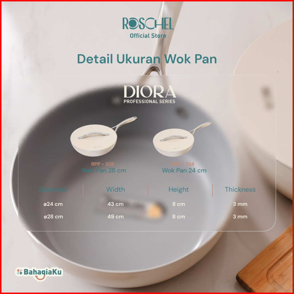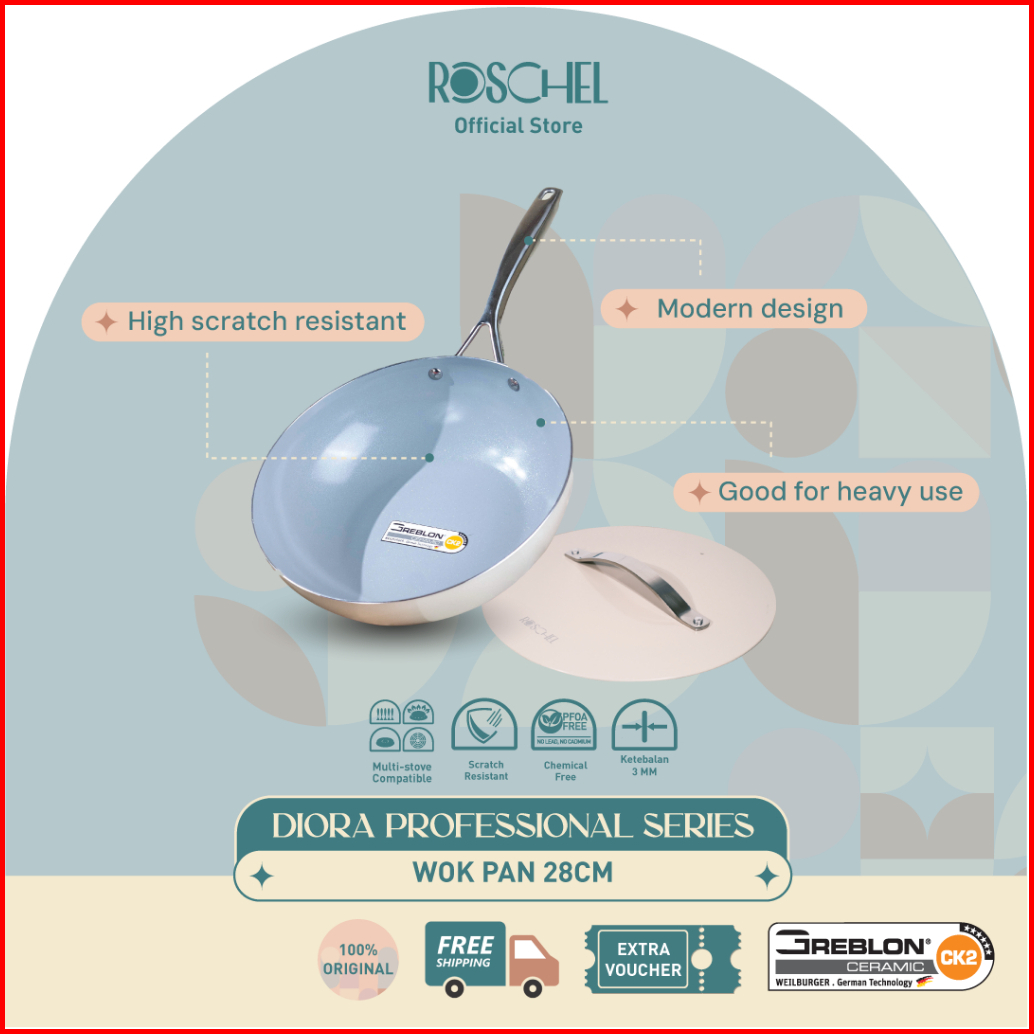 Roschel Diora Professional Wok Pan Lid 24 Cm 28 Cm Ceramic Non-stick Greblon Ck2 German Coating Panci Wajan Penggorengan