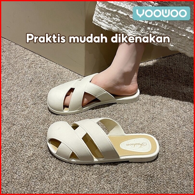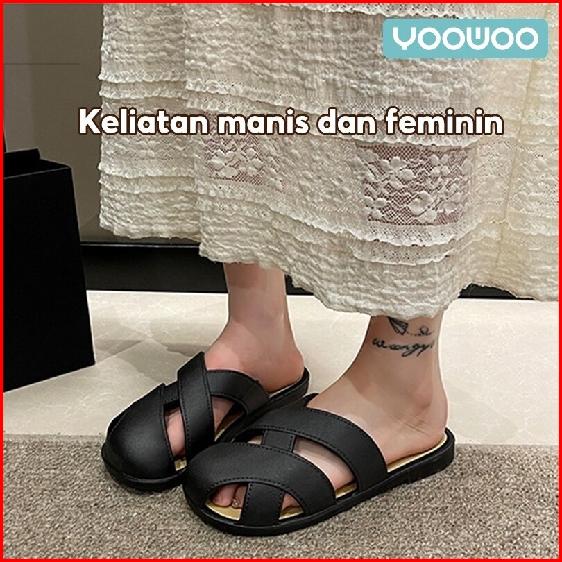 Yoowoo Sandal Wanita Flatshoes Wanita Sandal Wanita Kekinian Sandal Wanita Silang Rice White Hitam