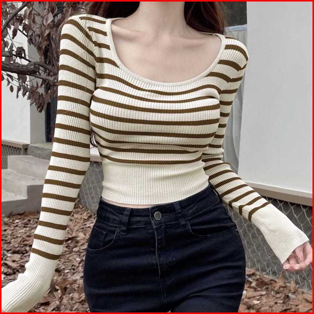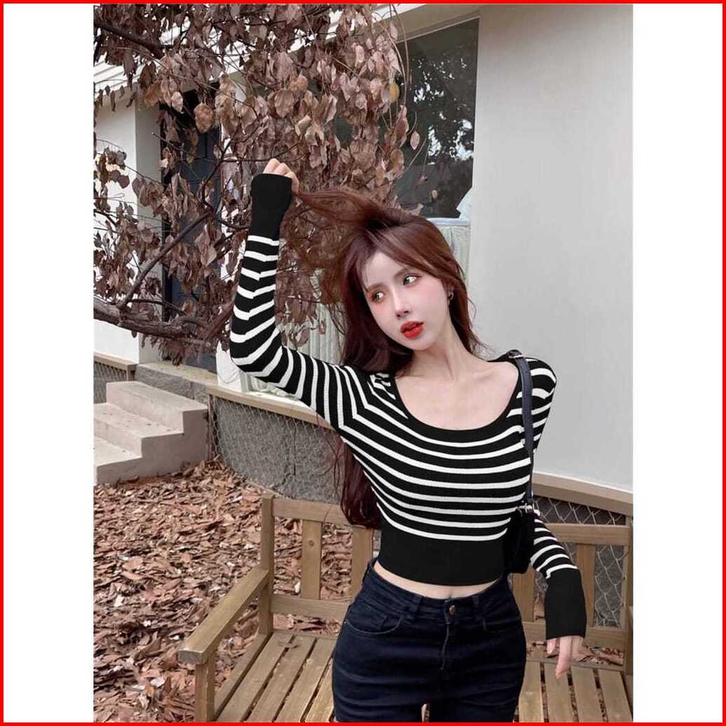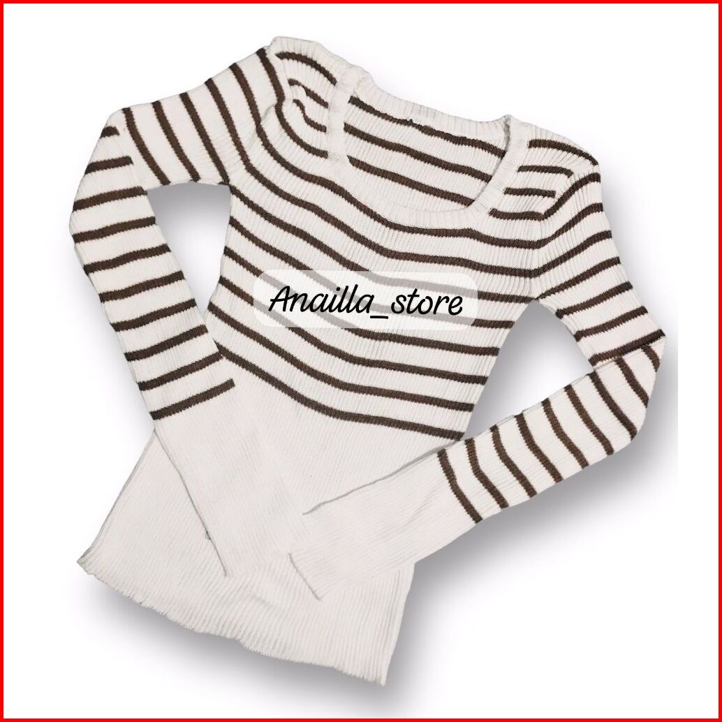 Anailla Crop Top Strip Atasan Rajut Wanita Korea Premium