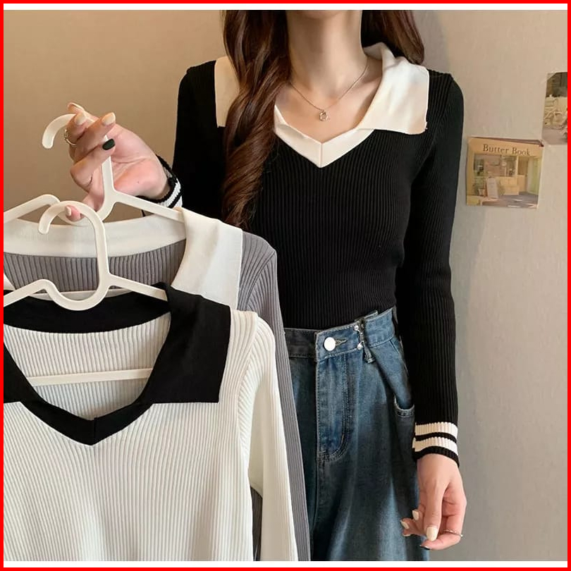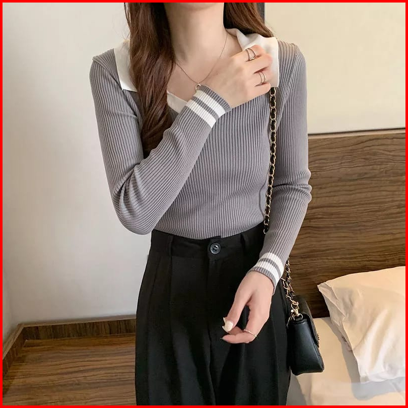 Anailla Atasan Rajut Wanita Strip Krah Polo Iner Rrajut Premium Lengan Panjang