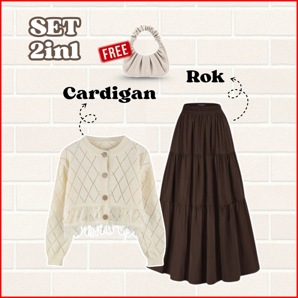 One Set Wanita Korean Style Cardigan Crop Rawis Broken White Rok Susun Coklat Hijab Coklat Qnl114