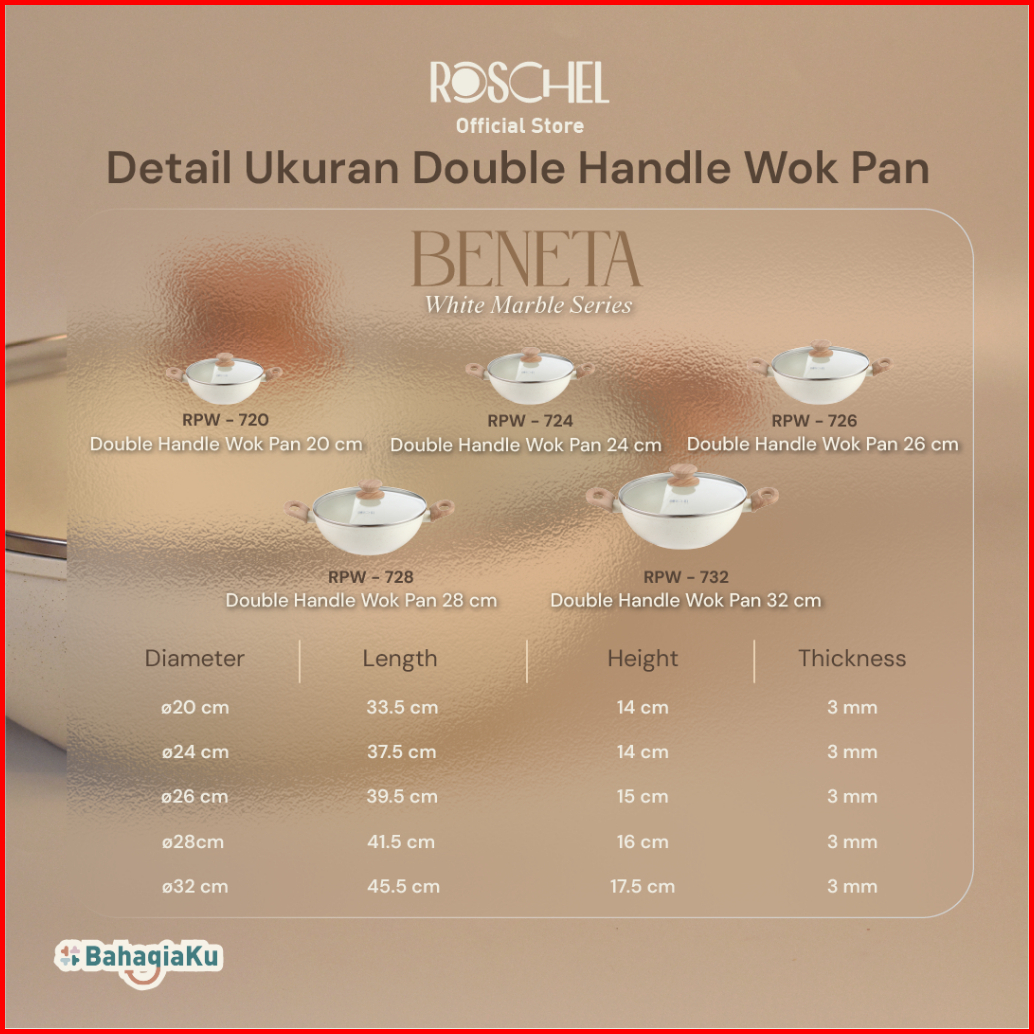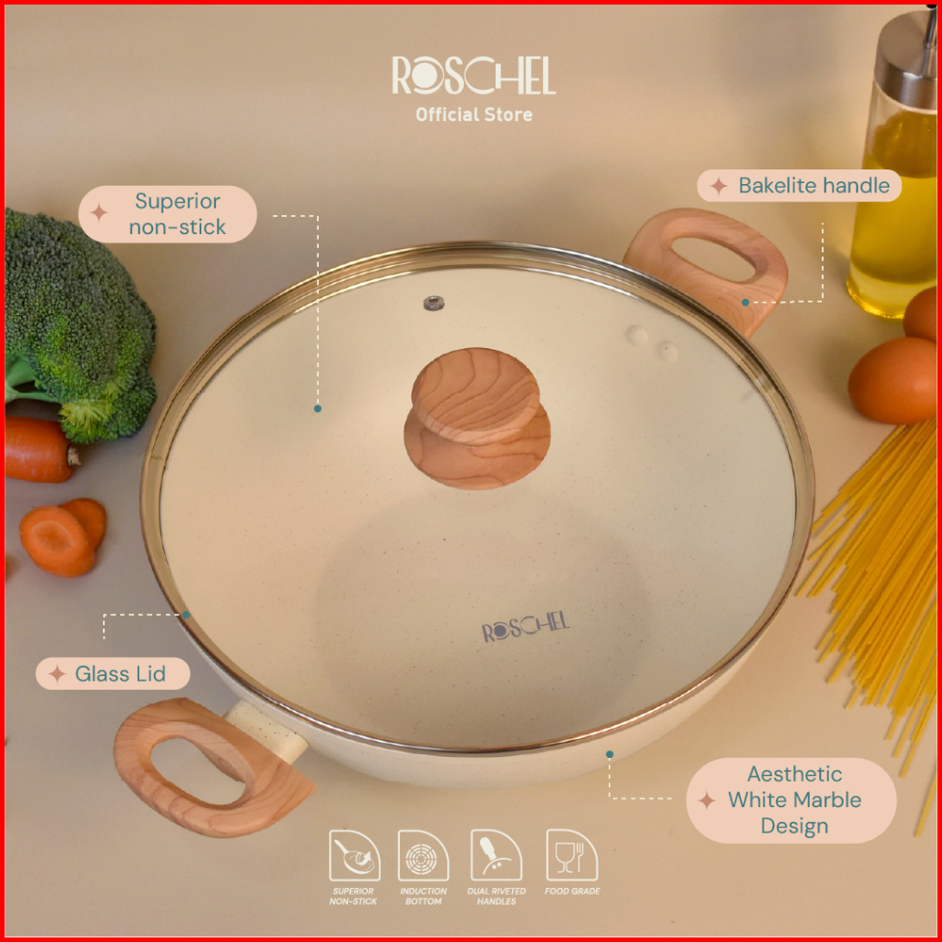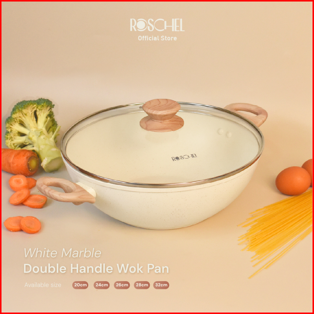 Roschel Beneta White Marble Coating Non-stick Double Handle Wok Pan 20 24 26 28 32cm Tutup Kaca Panci Wajan Penggorengan