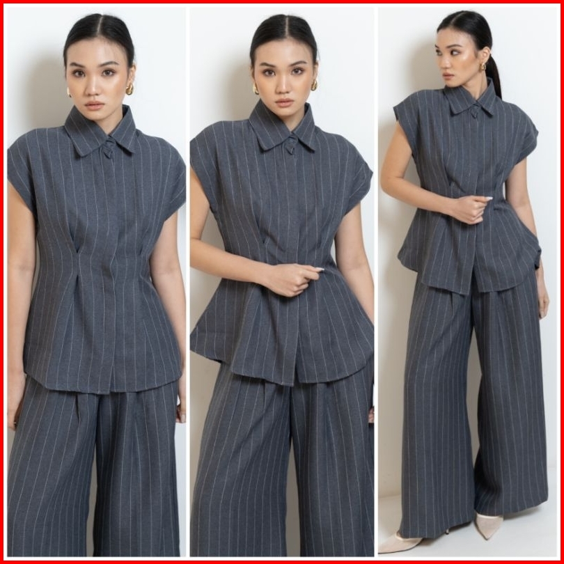 Ready Best Seller Sheliciousroom Premium Lokal Harper 2 In 1 Stripe Semiwool Set Collar Button Blouse With Long Cullote