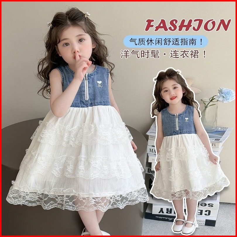 Princess Kesli 2-11 Tahun Gaun Anak Perempuan Musim Panas Baru Anak-anak Bergaya Denim Splicing Mesh Putri Gaun Bayi Man