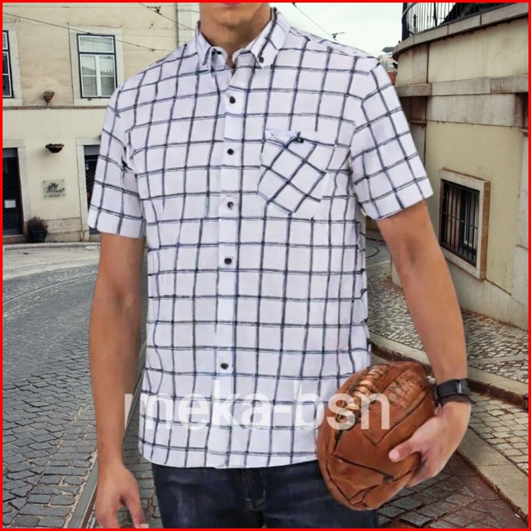 Kemeja Pria Lengan Pendek Putih Garis Best Seller Kain Flanel Super M-xxxl