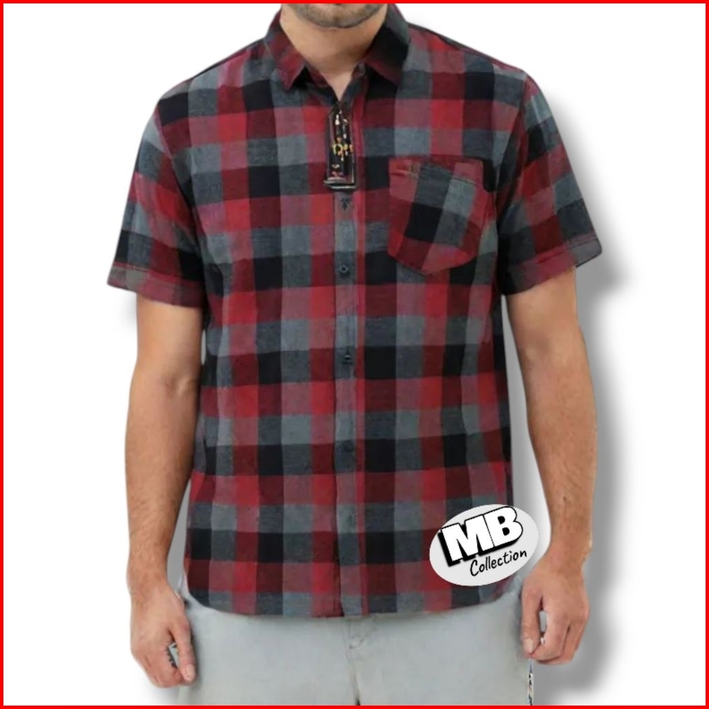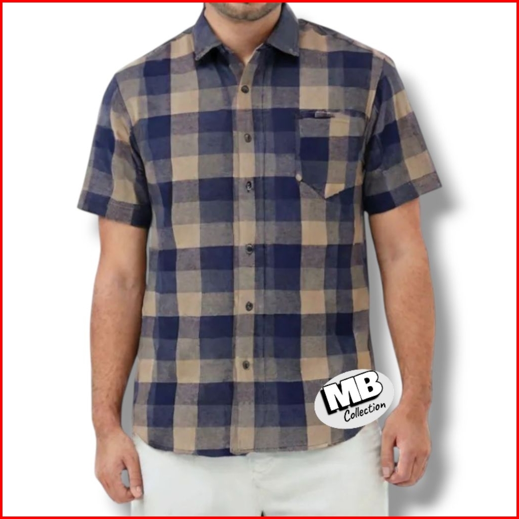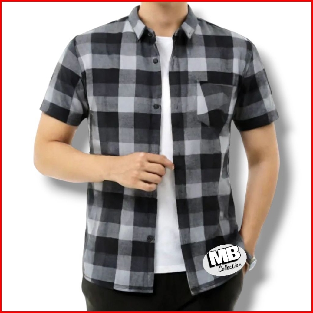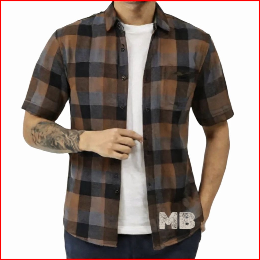 Kemeja Pria Motif Dimensi Kotak Kotak Lengan Pendek Tebal Lembut