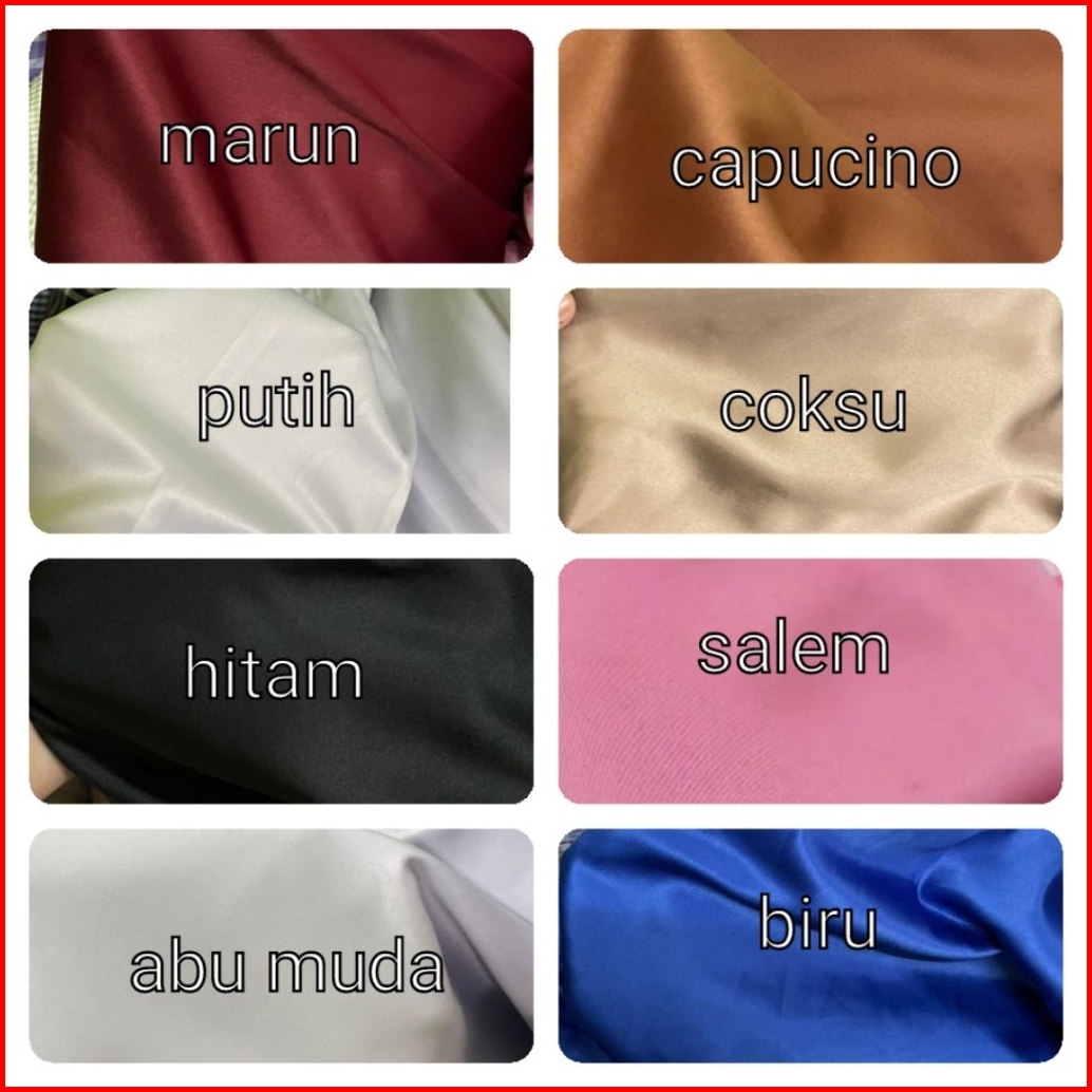 Hitam, Biru, Abu muda, Capucino, Coksu, Putih, Salem, Marun