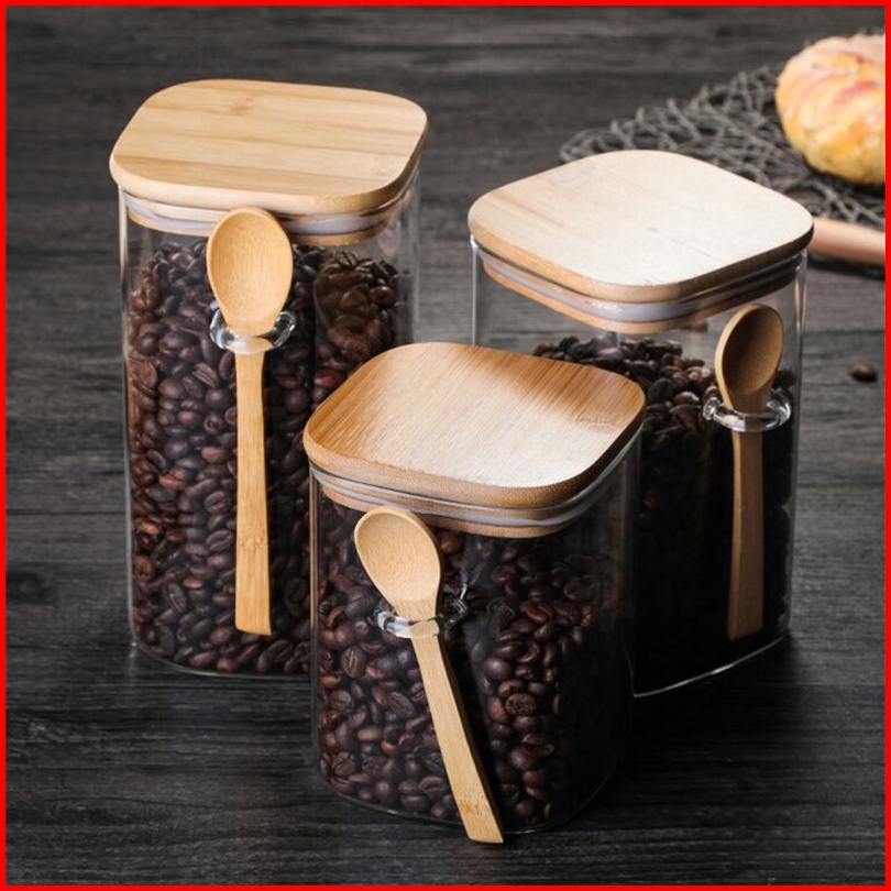 Ashome Toples Kaca Set Dengan Sendok Kayu Tutup Kayu Premium Elegan Glass Jar Stroage With Wood Spoon Toples Kaca Set To