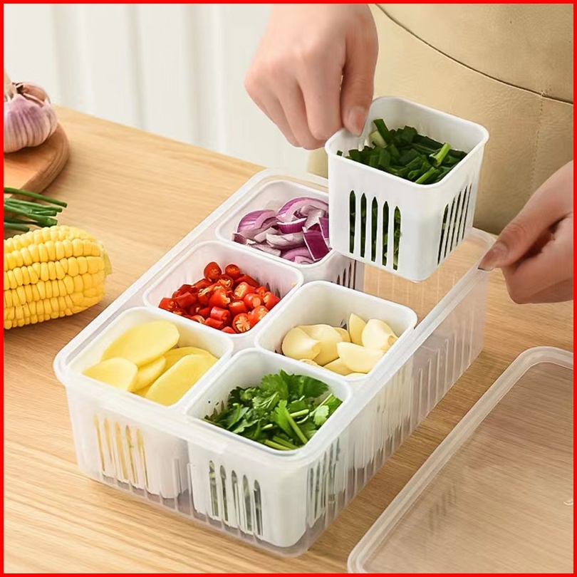 Tempat Penyimpanan 6in1 Saringan Pengering Sayuran Buah - Wadah Peniris Bawang Cabai Sayur - Box Plastik Makanan Serbagu