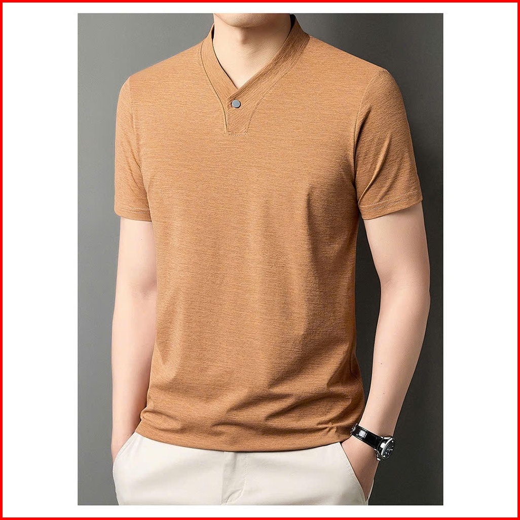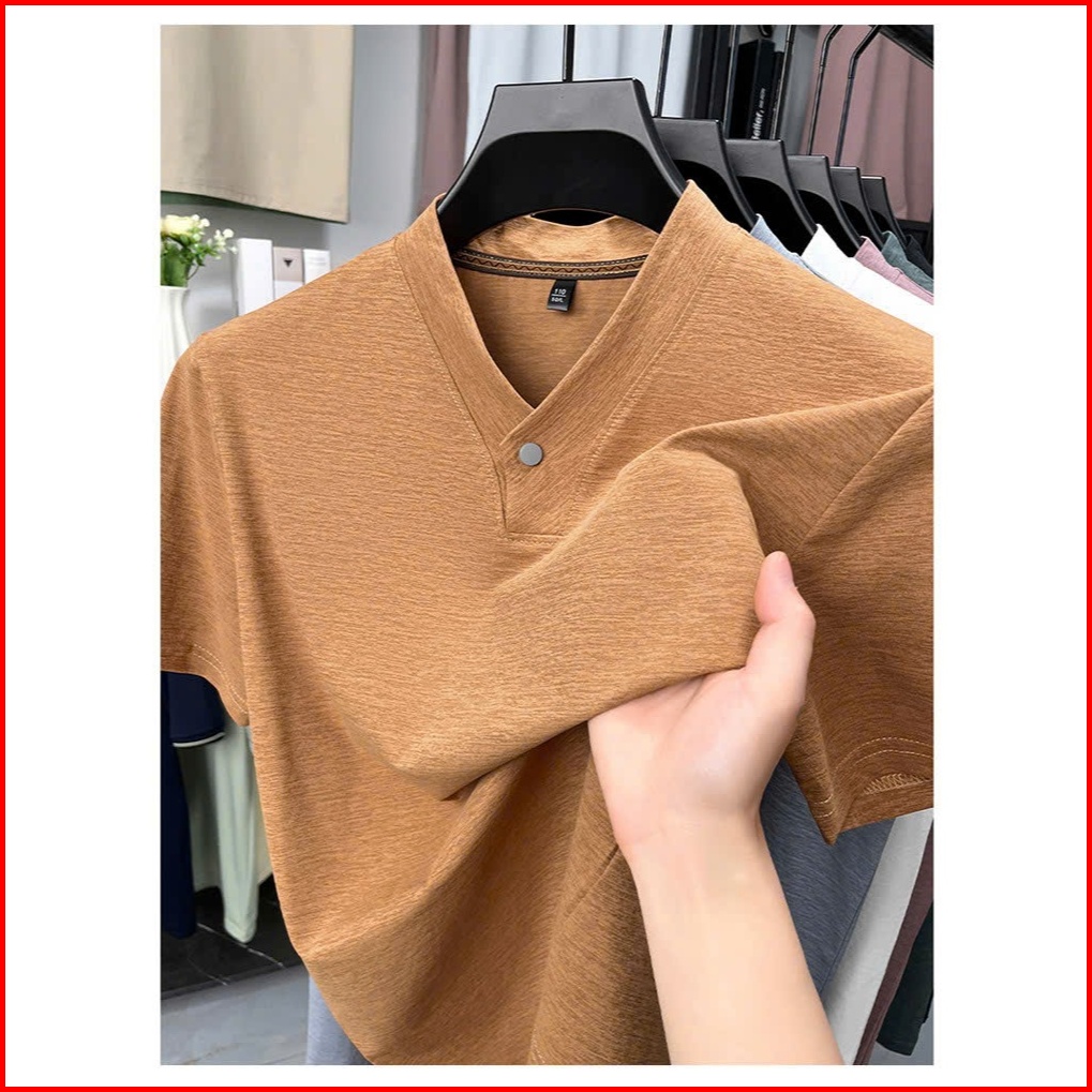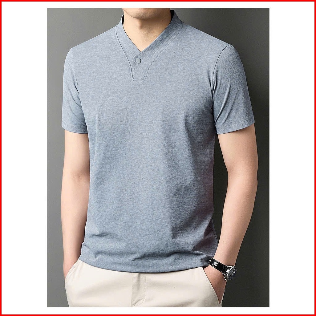 Kaos Lengan Pendek Pria Musim Panas Baru Tipis Dan Bernapas Bahan Sutra Dingin Satu Kancing Leher V Lengan Pendek