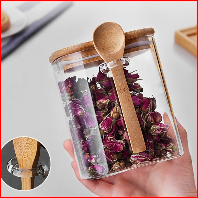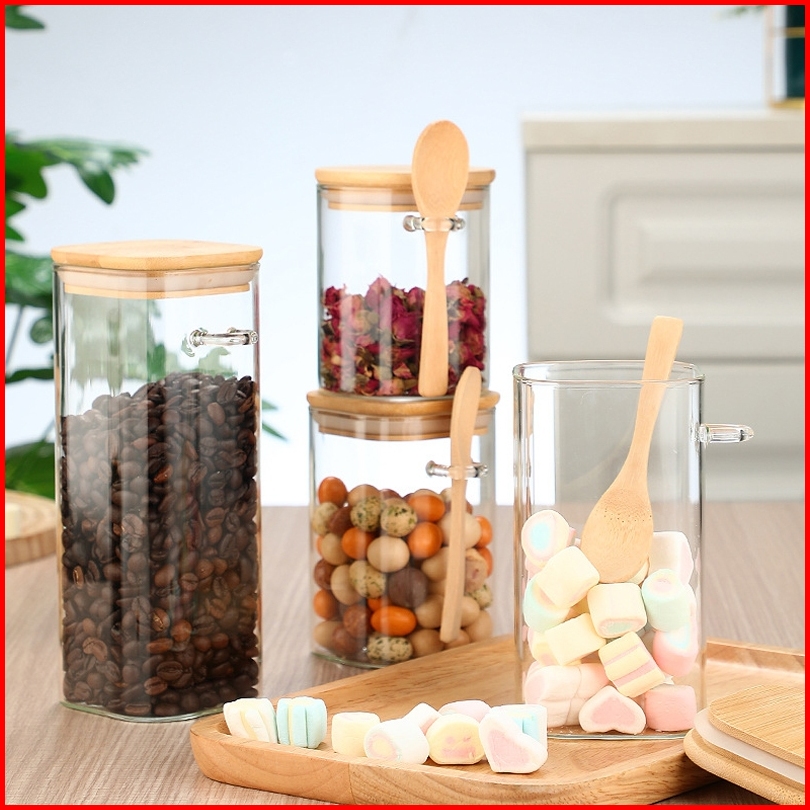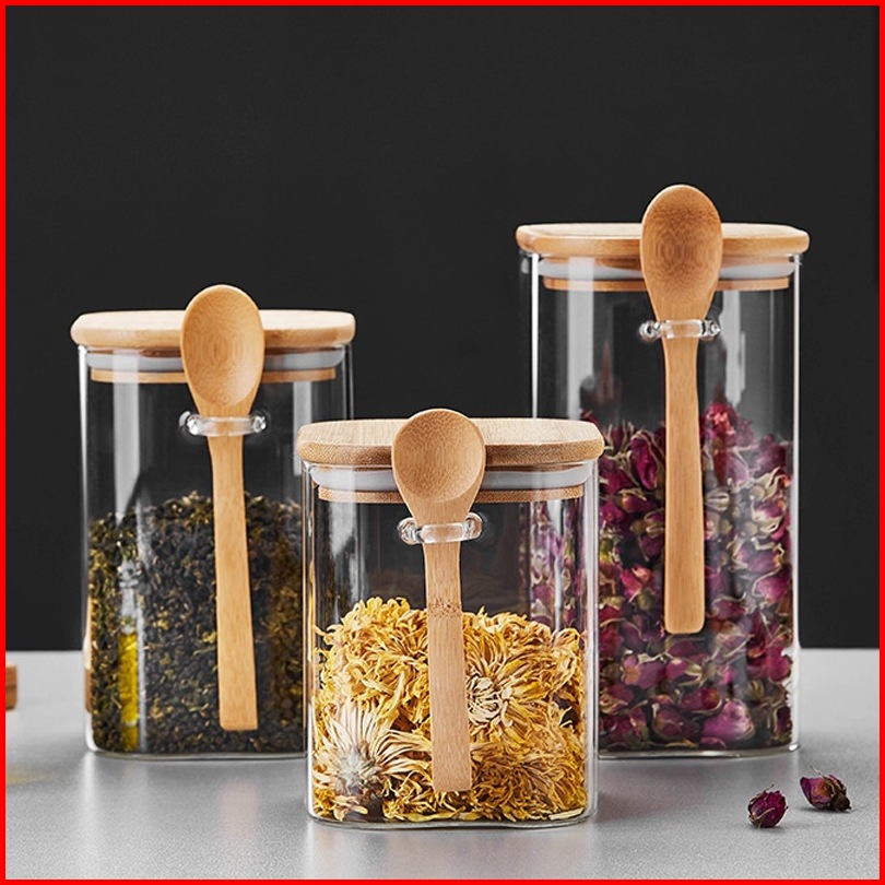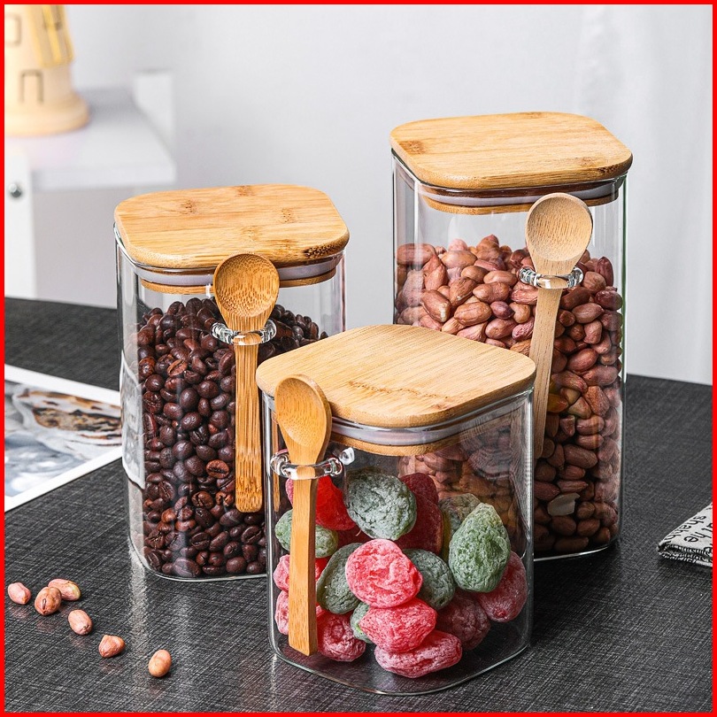 Toples Kaca Simpan Kopi Teh Gula Kedap Udara Tutup Bambu Bumbu Dapur Kedap Tempat Bumbu Toples Kaca Set Dengan Sendok Ka