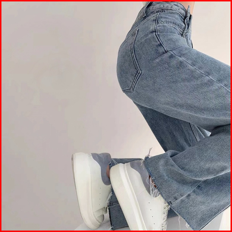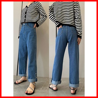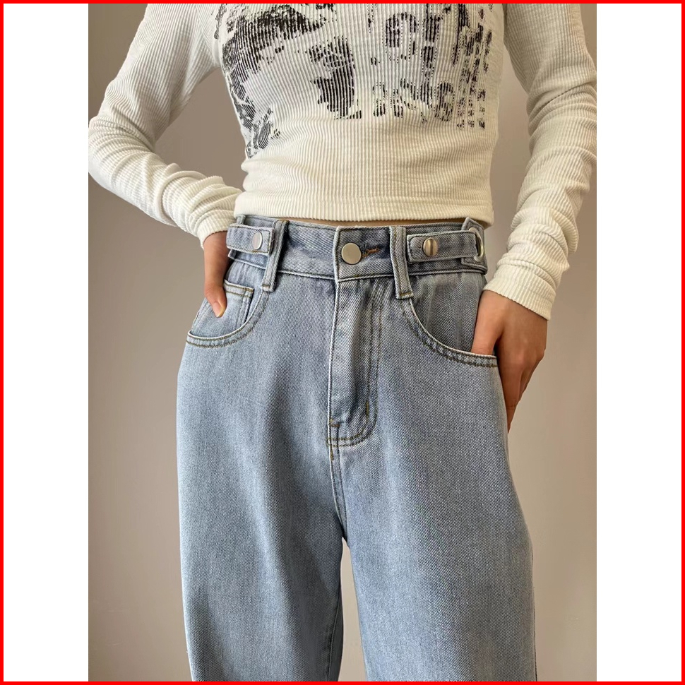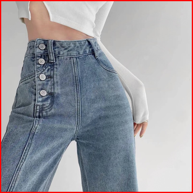 Celana Jeans Panjang Wanita High Waist Gaya Korea All-match Biru Tombol Elastis Pinggang Tinggi Bahan Lurus