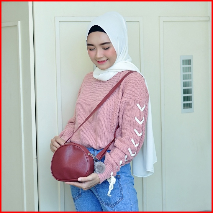 Slingbag Novita Pompom - Grosir Tas Selempang Wanita Kekinian Sling Bag Fashion Elegan Lucu Murah