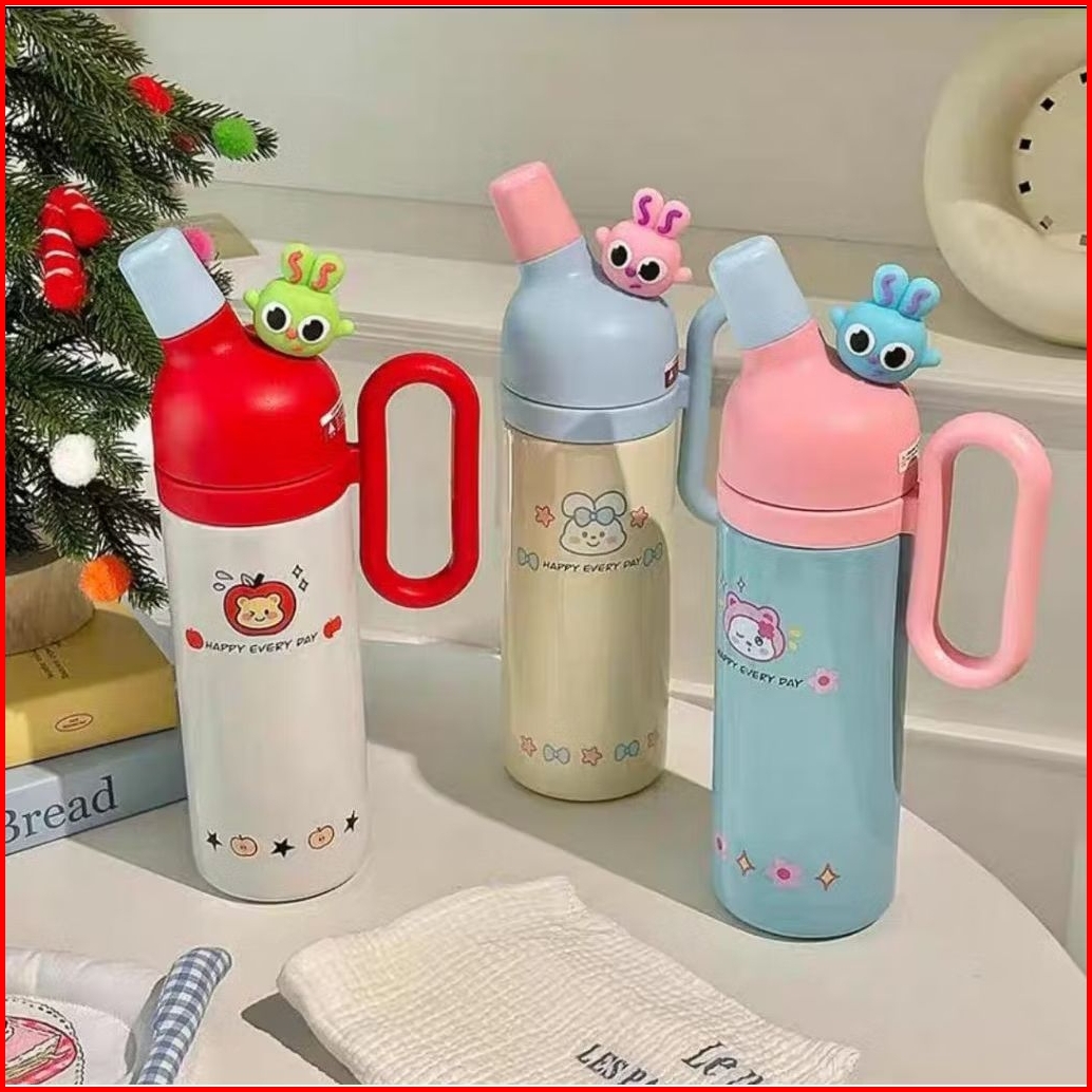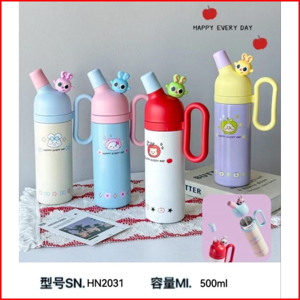 Tumbler Minum Stainless Steel 316 Termos Viral Lucu Happy Every Day Portable Vacuum Cup Dengan Gagang 500ml 2031