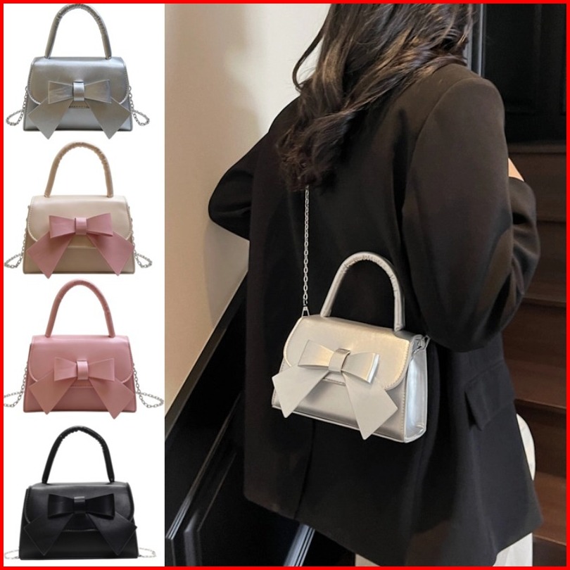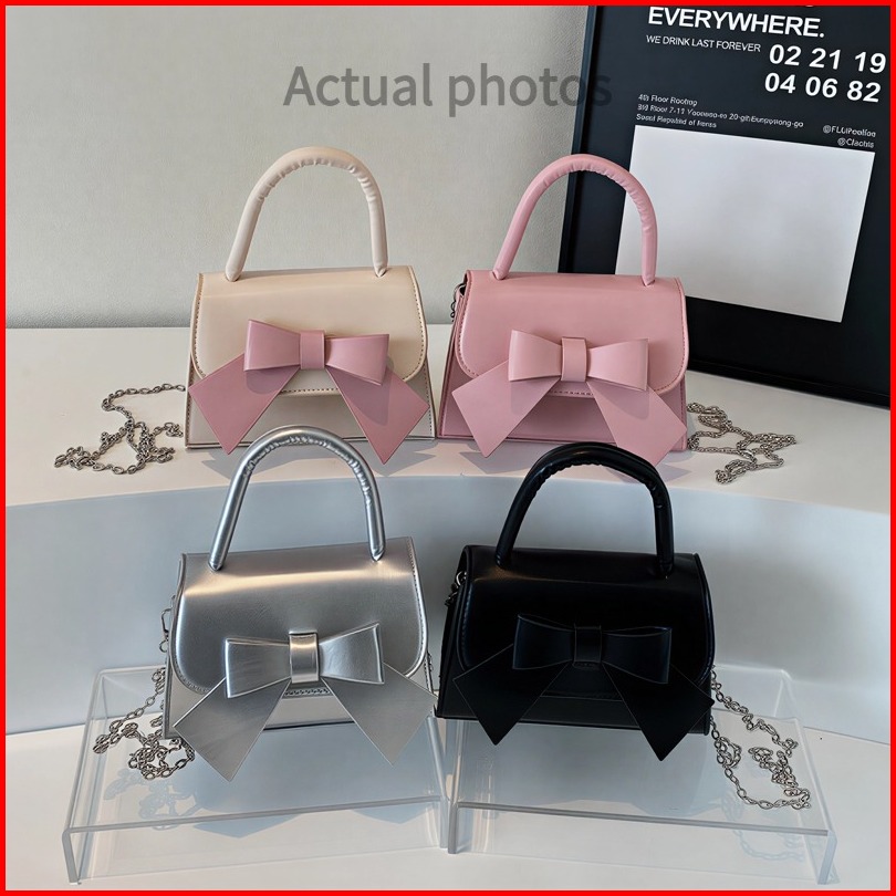 Tas Selempang Kulit Persegi Berwarna Solid Untuk Wanita Tas Tangan Gaya Korea Berdesain Busur Rantai Untuk Wanita Tas Se
