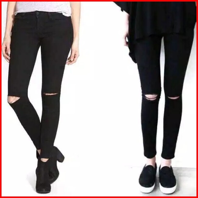 Celana Jeans Sobek Lutut Wanita - Riped Jeans - Hitam