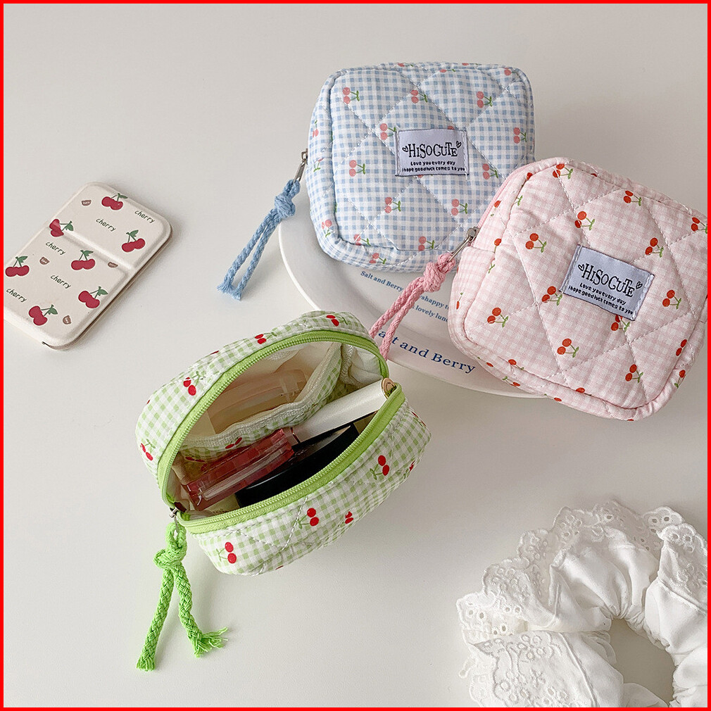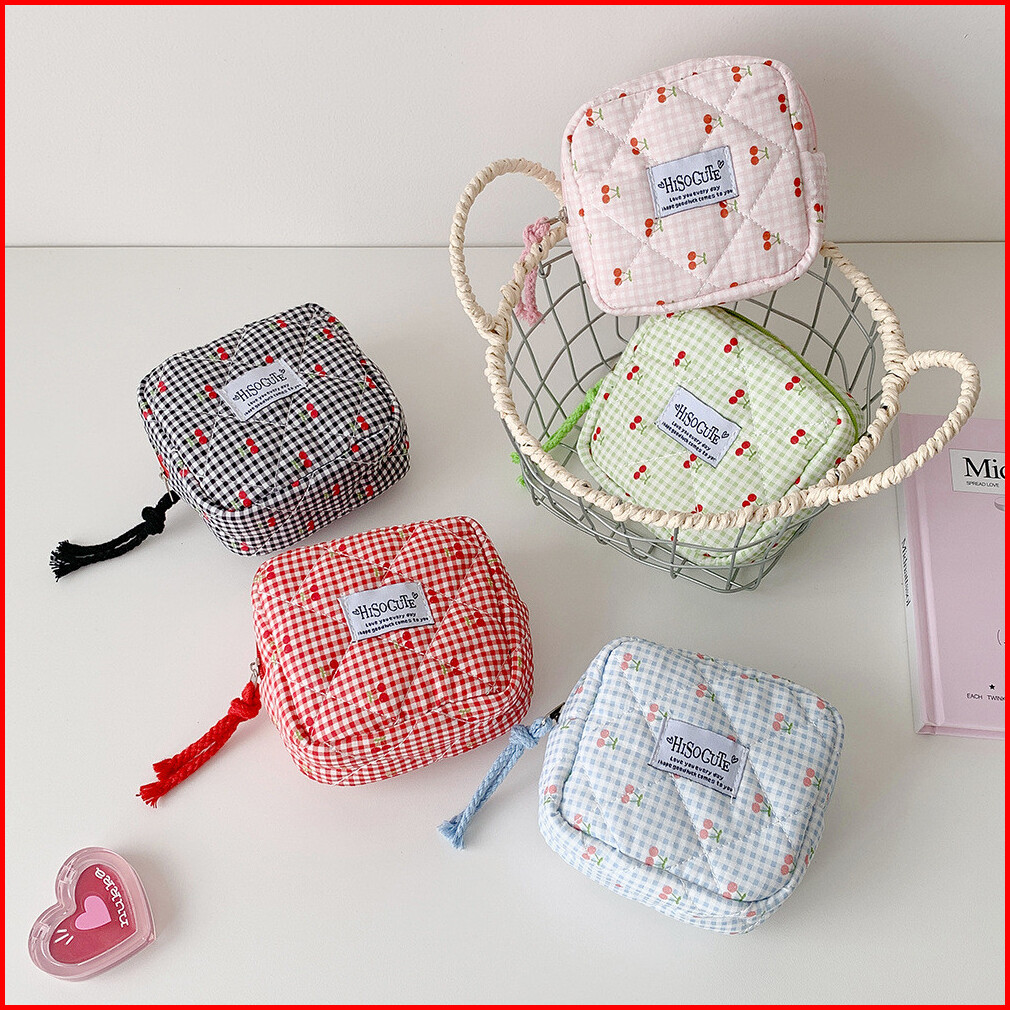 Shinsday Tas Kosmetik Mini Pouch Makeup Tas Pembalut Kotak-kotak Cherry Simple Organizer Serbaguna Travel Pouch Korea Mi