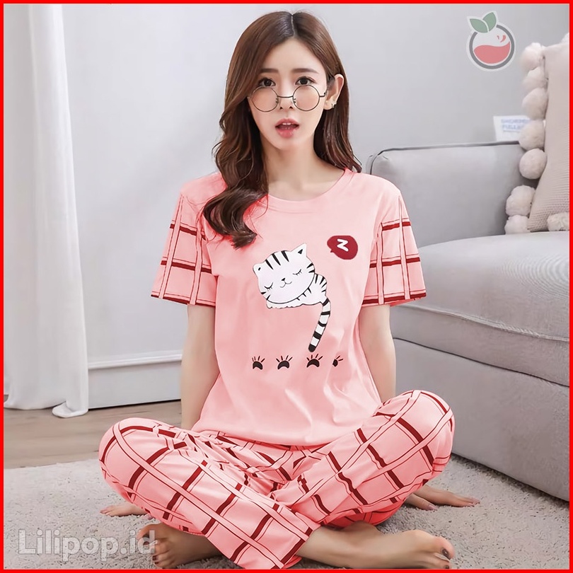 Lilipop.id Baju Tidur Wanita Cp Sleep Cat Setelan Piyama Babydoll Kaos Celana Panjang