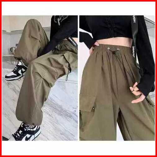 Celana Cargo Wanita Highwaist Loose Korean Stail Standart Jumbo Tali Serut Out Door