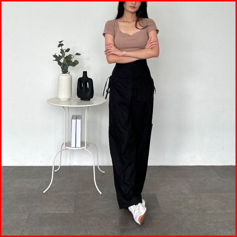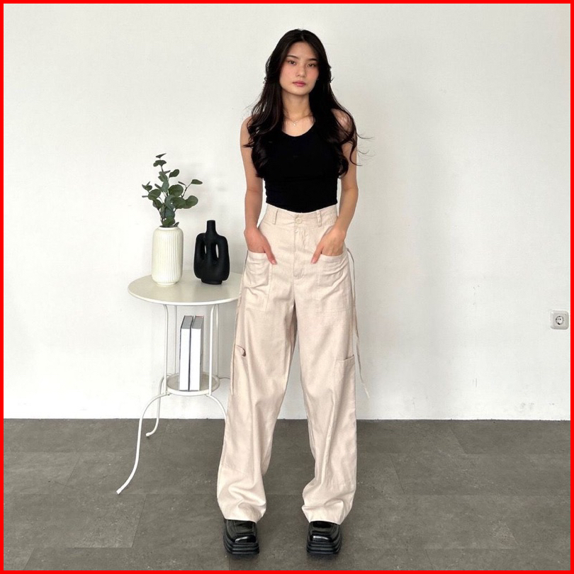 Luxoyez Bisa Livy - Celana Cargo Katun Drill Highwaist Loose Cargo Pants Ribbon String I059