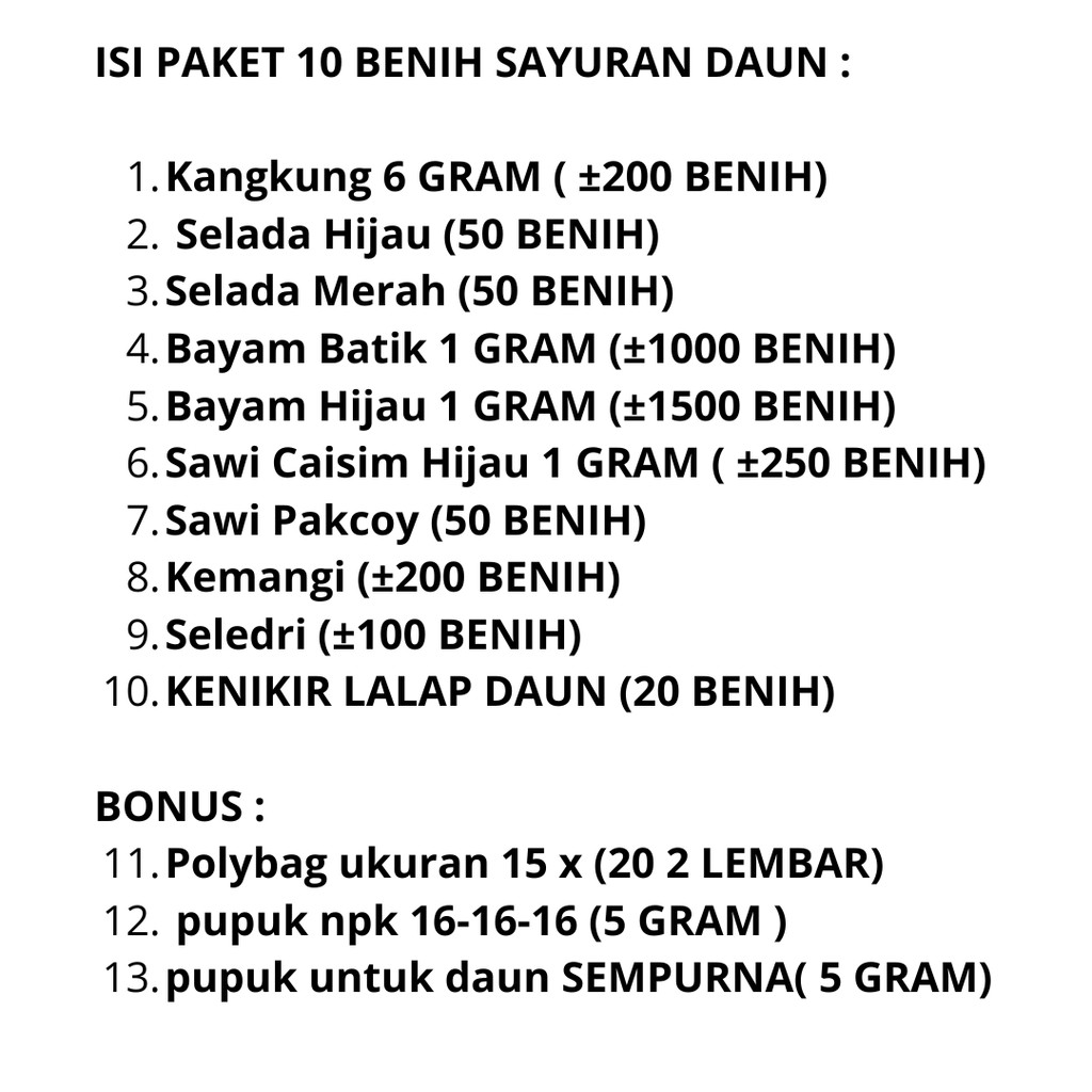 Paket 10 Jenis Benih Sayuran Daun Bibit Sayuran Lengkap 10 Jenis Kangkung Bayam Hijau Merah Sawi