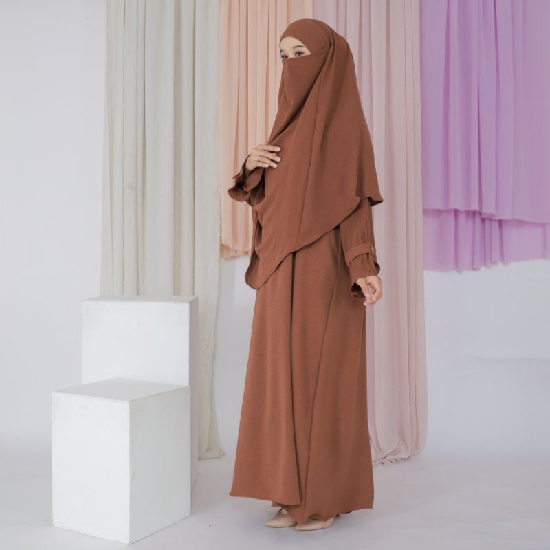 Naura Abaya Plisket Set kerudung Muslim Syari French khimar((Gamis Umroh Haji Set Kerudung dan Khimar)