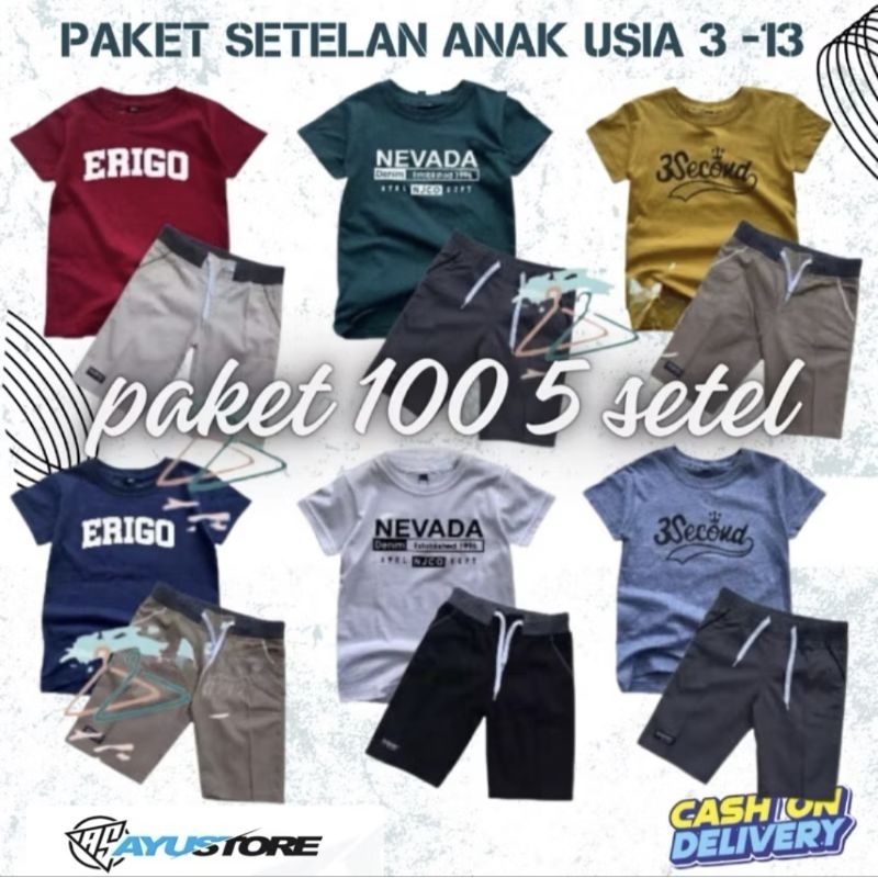 PAKET SETELAN ANAK ISI 5 STEL COWOK CEWEK BAJU PEREMPUAN DAN CELANA CHINOS MOTIF