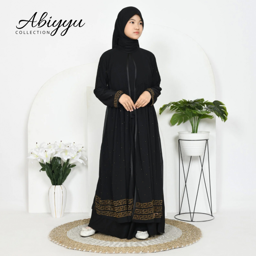 Abaya Turki Hitam Putih Couple Ibu dan Anak Perempuan Baju Gamis Turkey Remaja Tanggung Bahan Jersey mix Ceruty dengan Mote Silver, Dan Gold Mewah