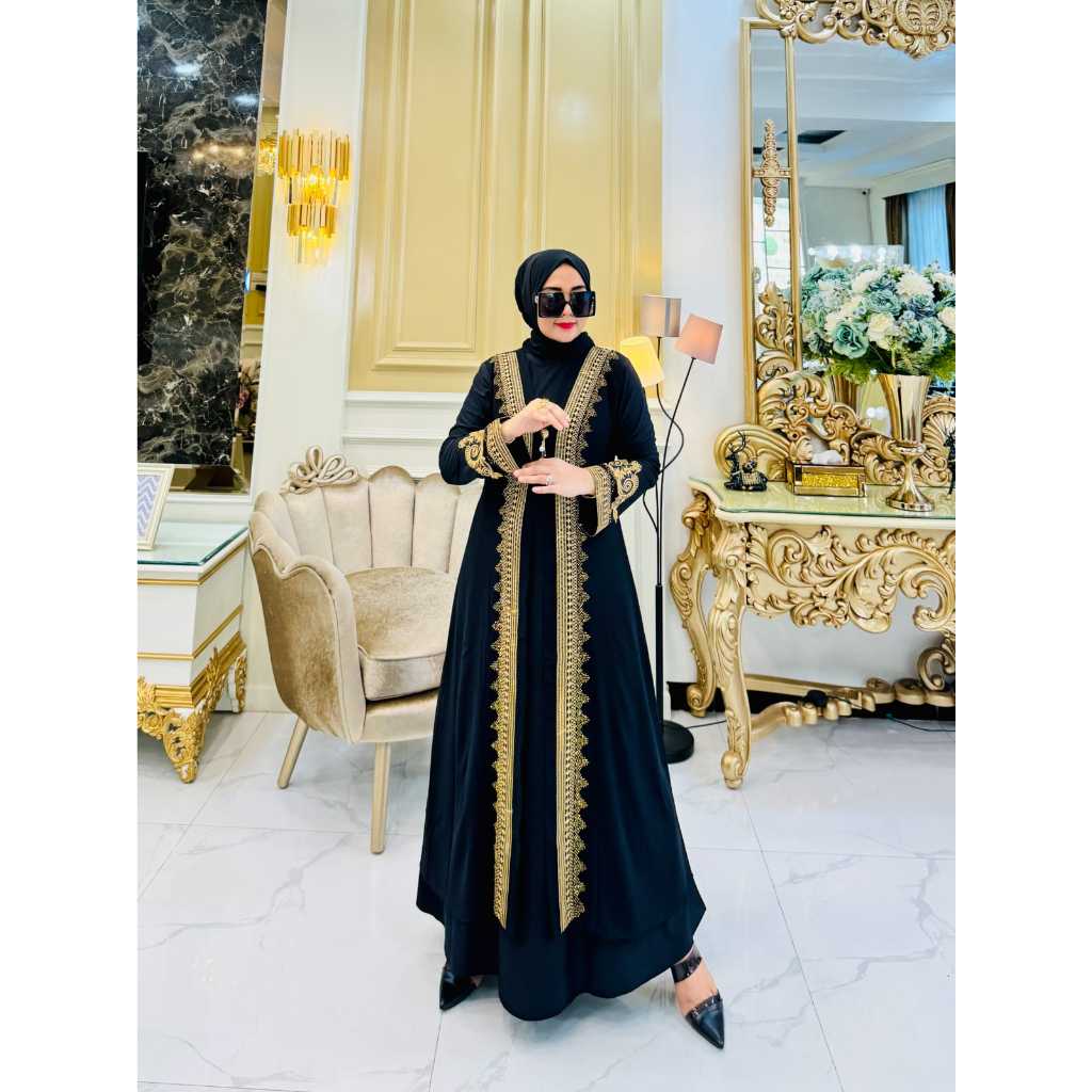 Gamis Abaya Hitam Turkey Bahan Jersey Mix Ceruty Bordir / Baju Busana Maxi Dress Muslim Wanita - List Gold