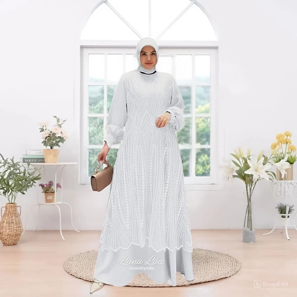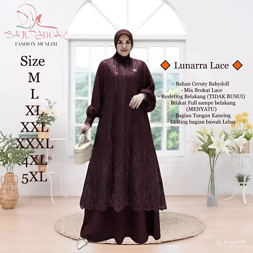 Lunarra Lace Baju Gamis Raya Wanita Muslimah Bahan Ceruty Babydoll Mix Brokat Mewah Elegan Pesta