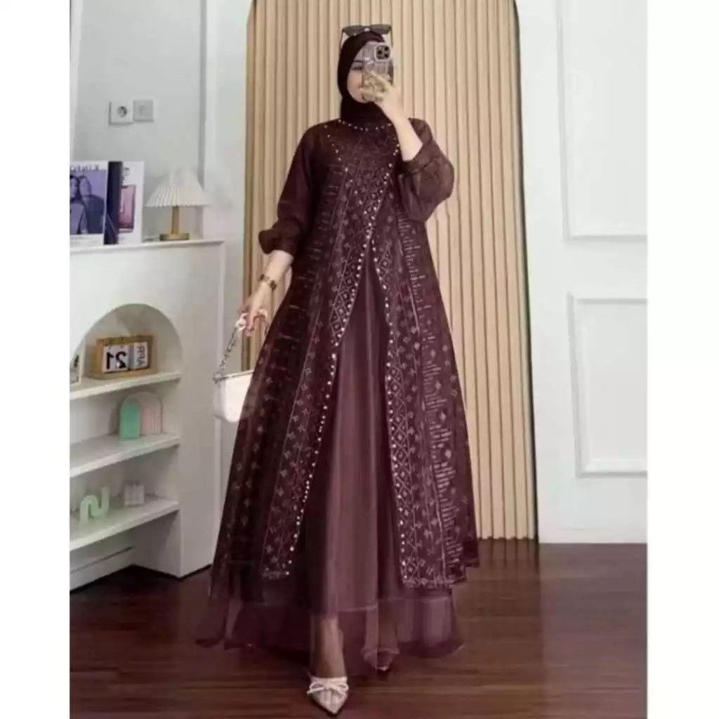Keyla Dress Gamis Mewah Bahan Tille Mix Brukat Full Puring Payet Mutiara Gamis Pesta Mewah Simpel