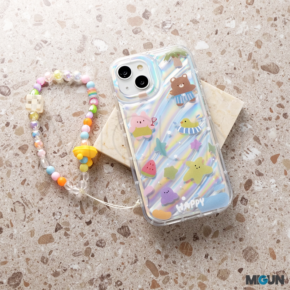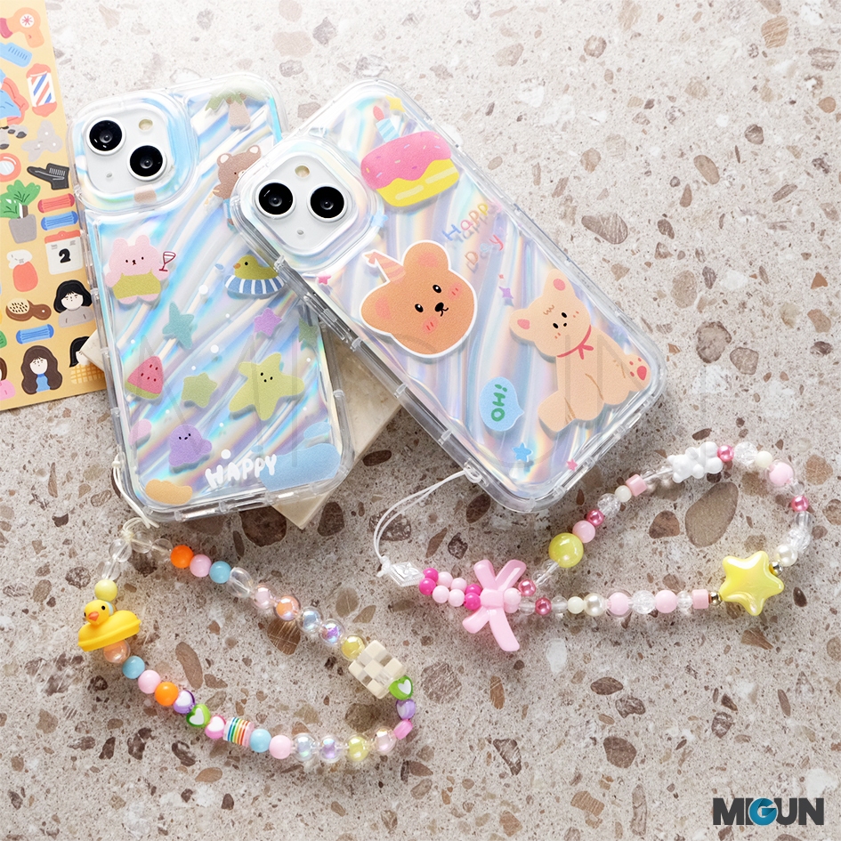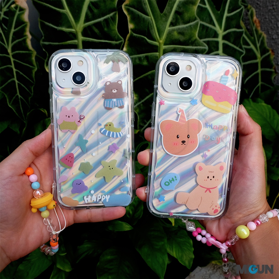 Set Korean Bear Case + String. Softcase Hologram Full Cover for iPhone 15 15Pr0 15Pr0max 15plus 7 8 SE2020 7+ 8+ 11
