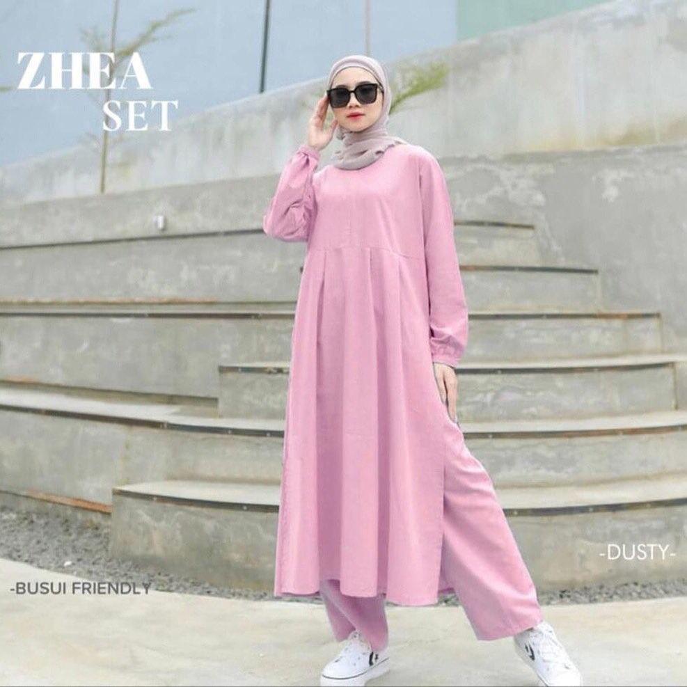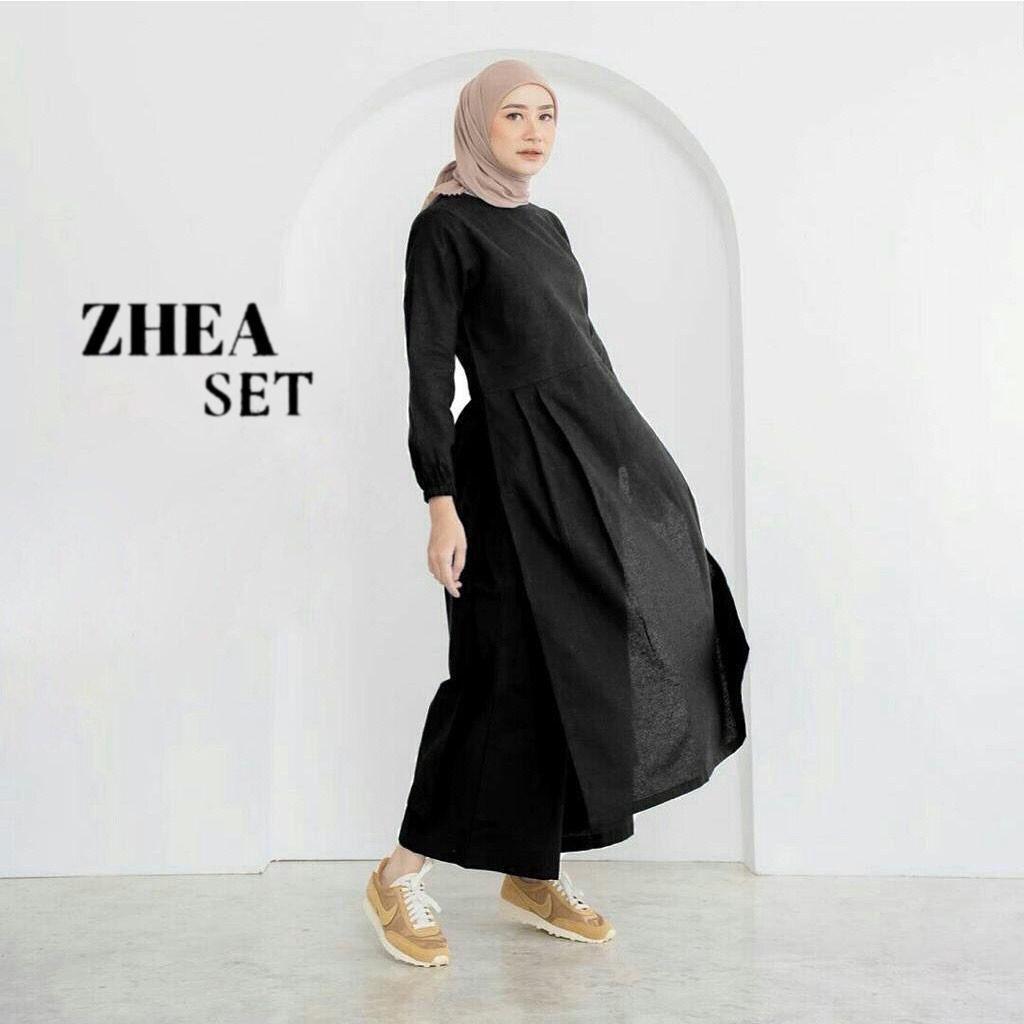 Zhea Setelan, Long Tunik, Celana KulotBahan Katun Linen, Fashion Muslim, One Set, Set Wanita