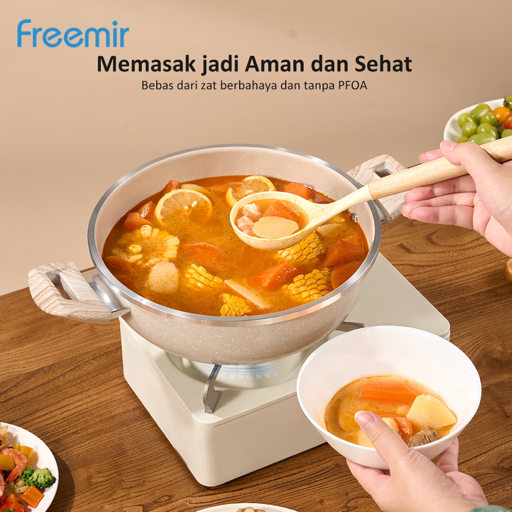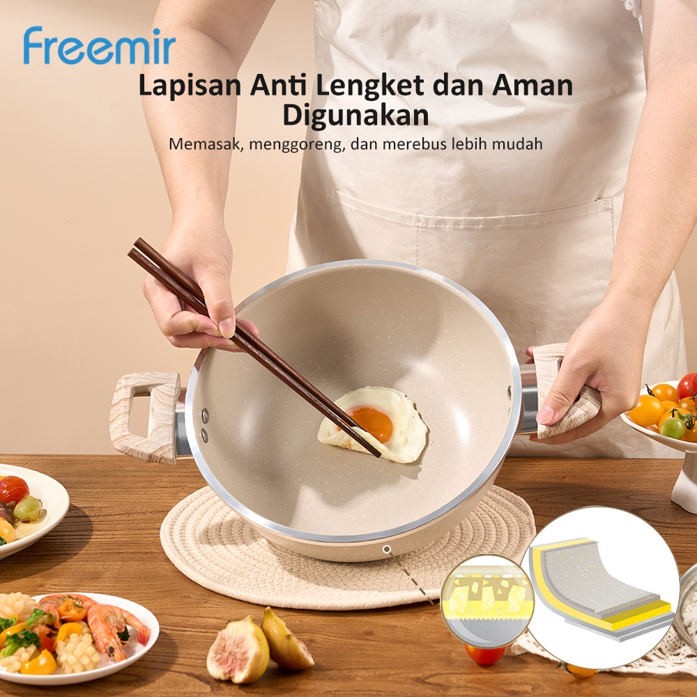 Freemir Wajan Panci Kuping Wokpan Anti Lengket Multifungsi 24Cm Dengan Tutup - Beige Double Bottom