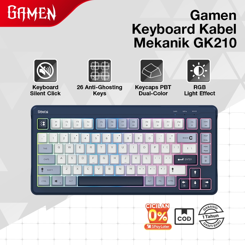 GAMEN Keyboard Gaming Mechanical Silent Click Keycaps PBT Dual Color RGB Light GK210 Original - Garansi 1 Tahun