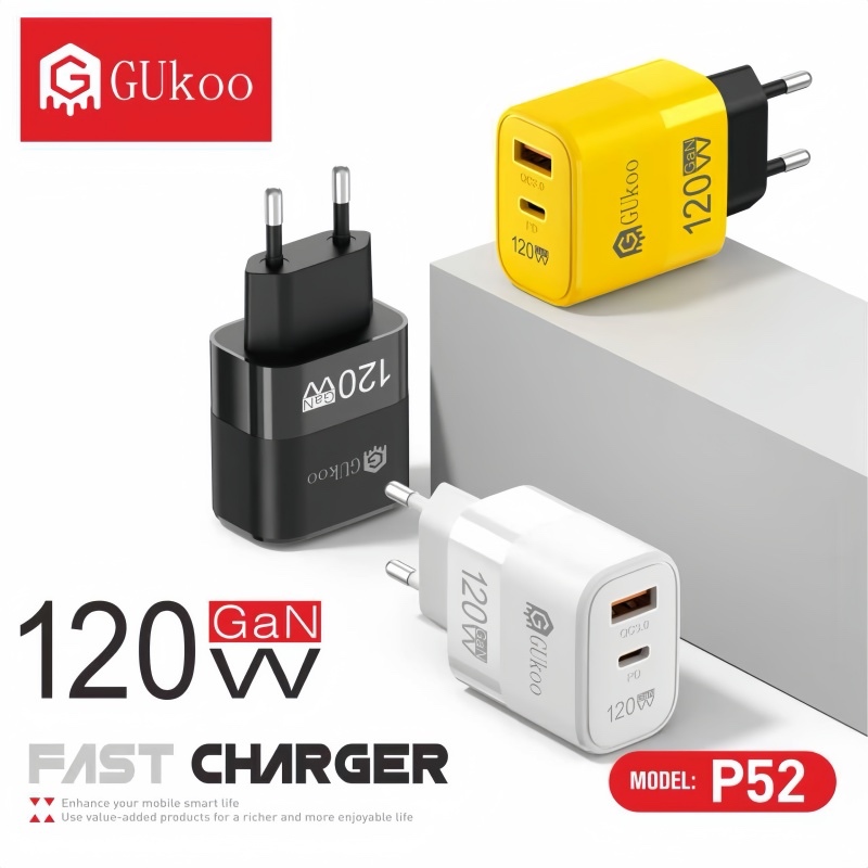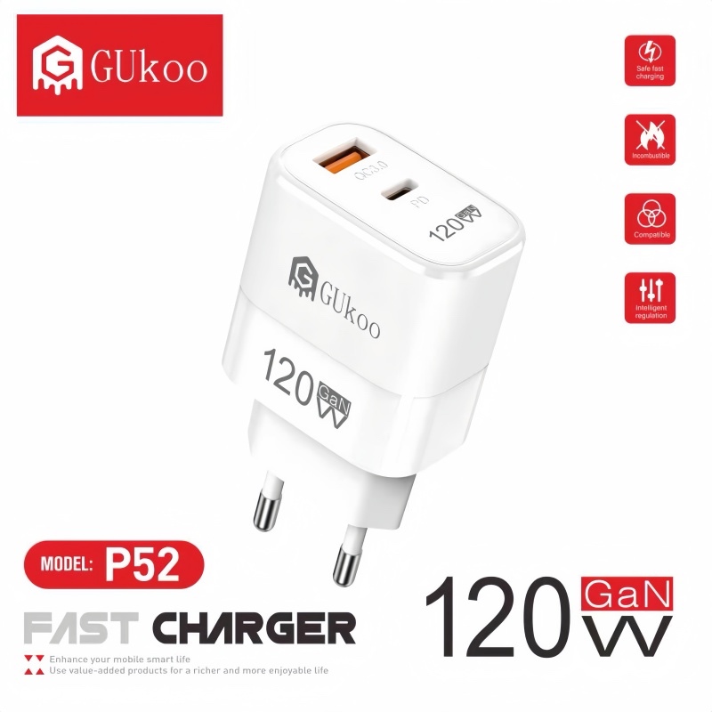 GUKOO Charger 120W Super Fast Charging Type C + USB - Untuk HP & Laptop - Pengisian Cepat & Aman