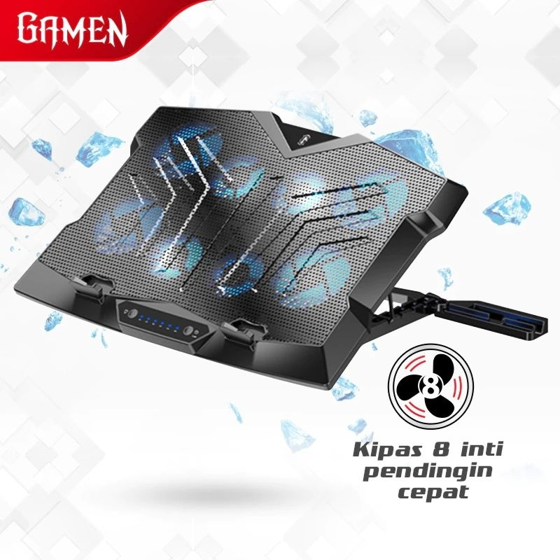 GAMEN GCP100 Gaming LapT0P Cooling Pad Stand Desain 8 Kipas Inti/Core Penyesuaian Sudut 5 Tingkat/Angle Penyangga U