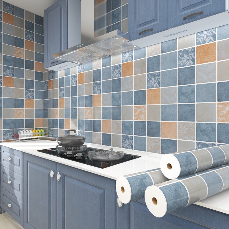 wallpaper dapur anti minyak dan panas stiker dinding 6 meter X 60 cm motif kotak2 biru orange