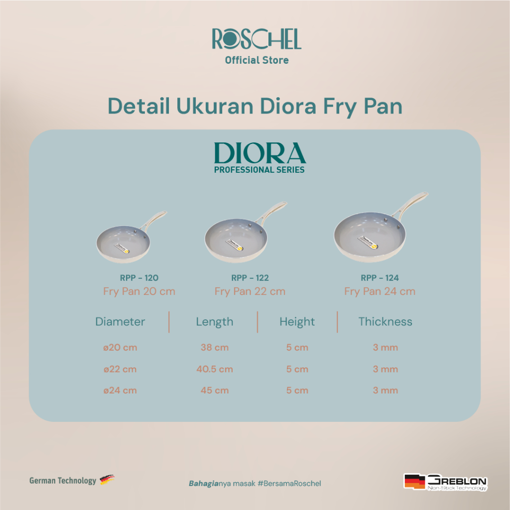 Roschel Diora Professional Fry Pan 20 Cm , 22 Cm , 24 Cm Ceramic Non-Stick Greblon Ck2 German Coating Panci Wajan Penggo