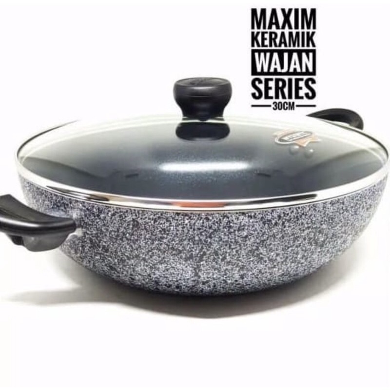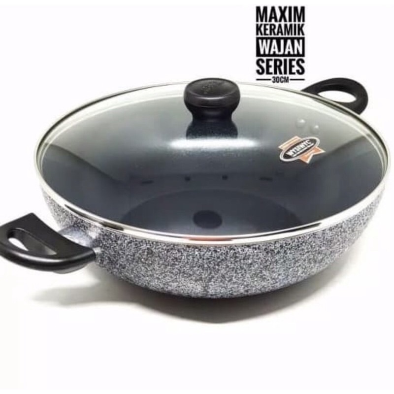Maxim Neostone Wok Marble Ceramic Wajan Penggorengan Anti Lengket 30 Cm + Tutup Kaca
