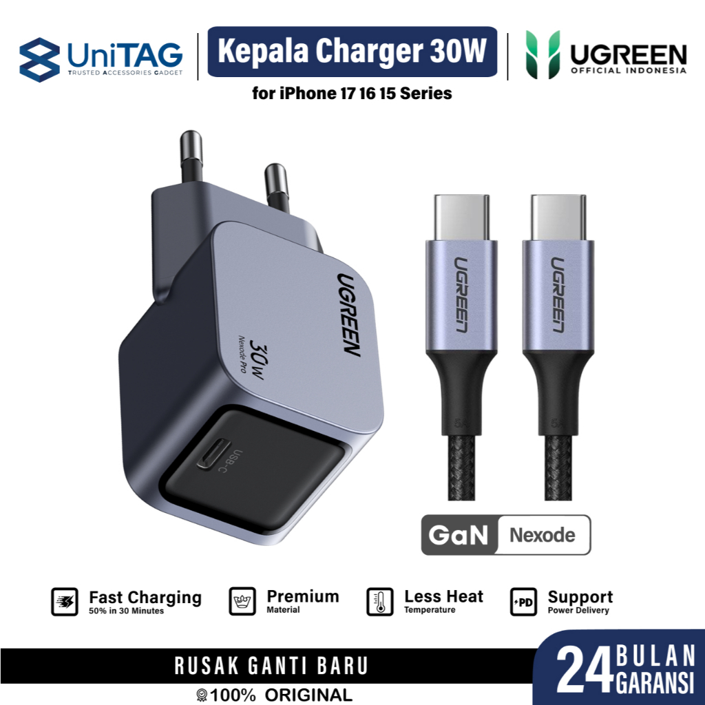 Kepala Charger for iPhone 17 16 15 Pr0 Max Plus iPad Air M2 Pr0 M4 UGREEN Adaptor Charger 20W 30W Nexode Pr0 Type C